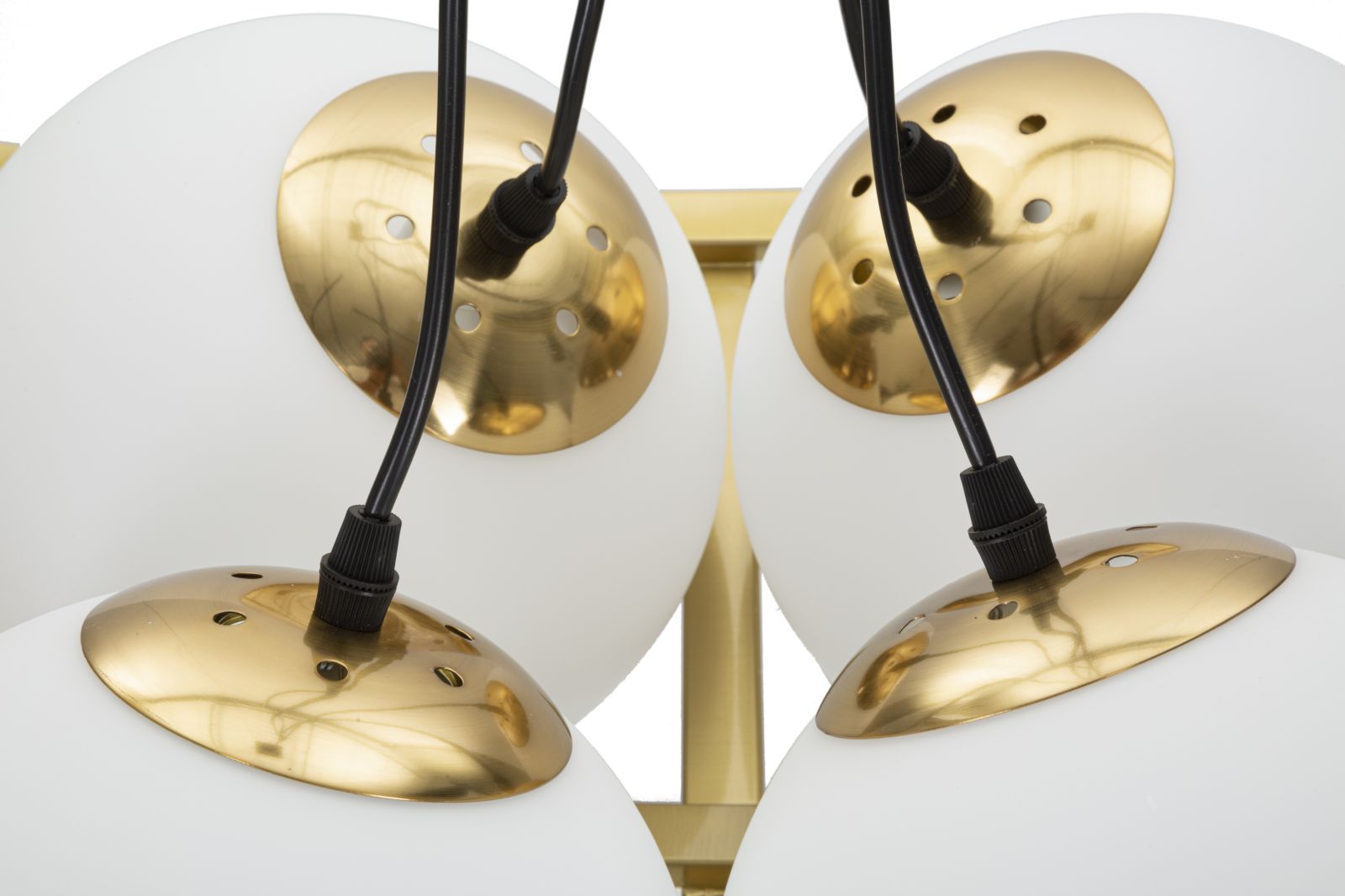 Lampadario in metallo dorato dalle linee geometriche con 4 punti luce in eleganti sfere di vetro bianco.