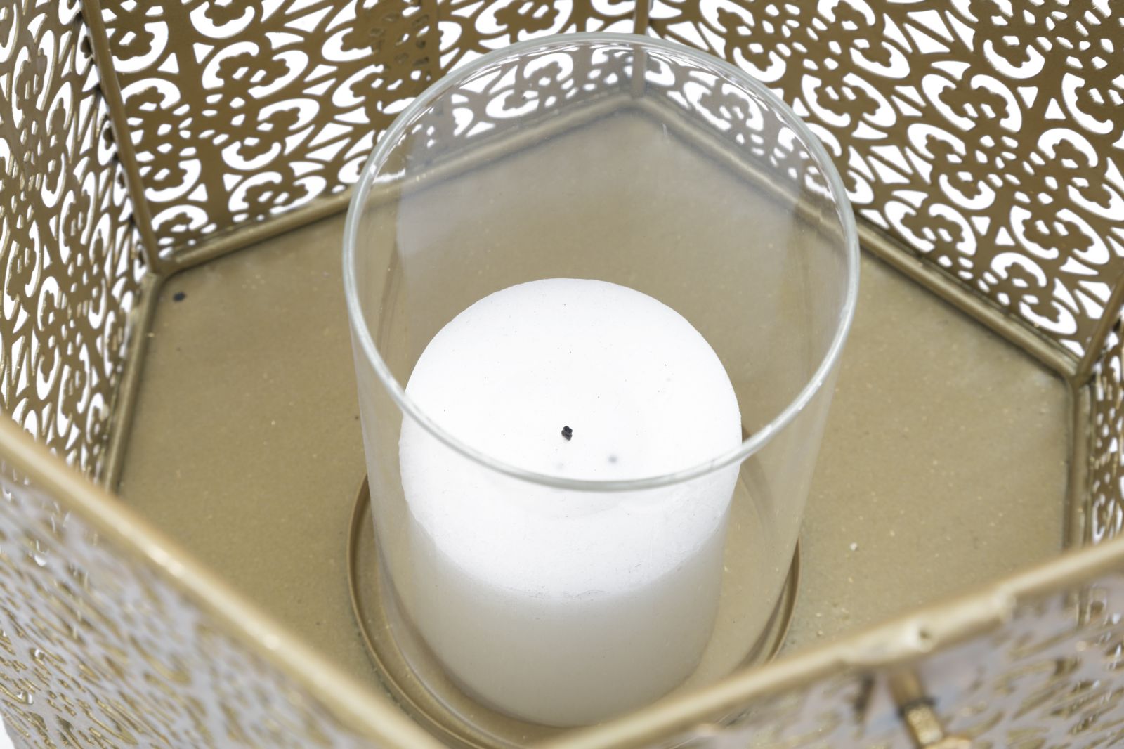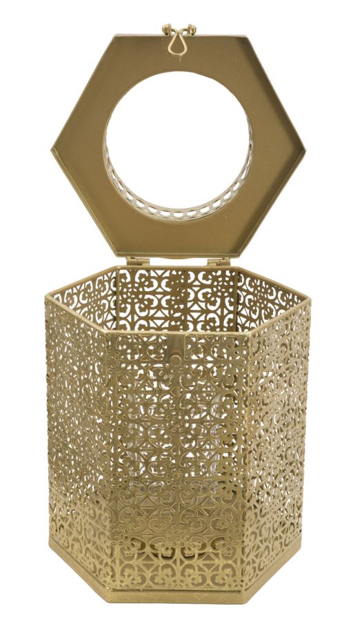Elegante lanterna con manico in metallo dorato. I particolari intagli, illuminati da una candela rendono magico ogni ambiente.