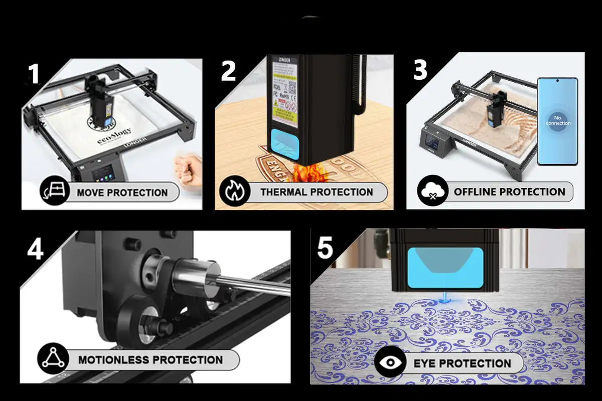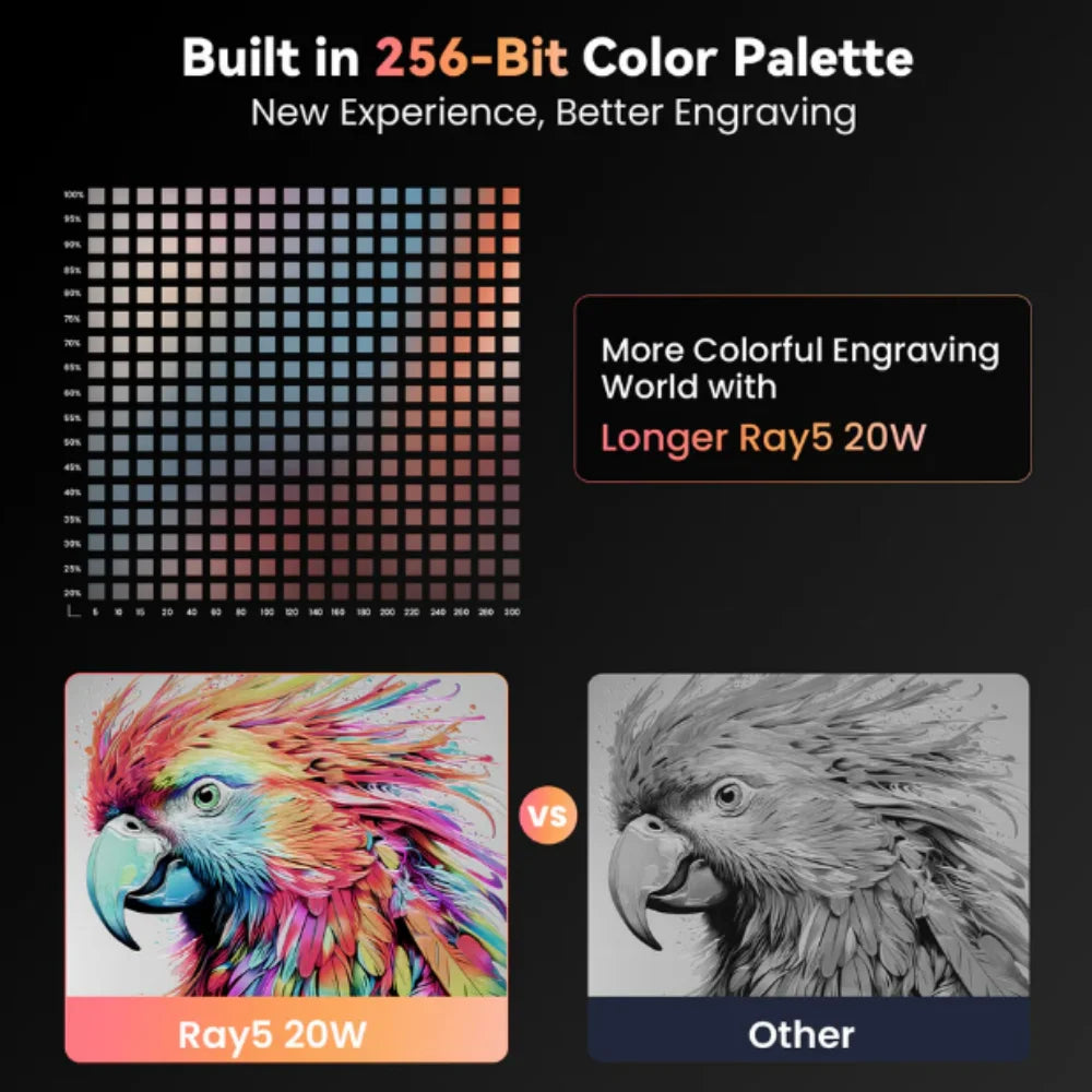 Découpe puissante 20W Les modules laser à sortie optique 22-24W augmentent considérablement la capacité de coupe du Ray5. Il coupe le bois de 25mm et l'acrylique de 35mm par plusieurs passes, Et couper 0.002 "/0.05mm d'acier inoxydable. ![]() Coupe de précision plus élevée et tache laser de haute précision de 0.08 * 0.1mm ² Le Ray5 est équipé d'un point de focalisation ultra-fin de 0.08x0.1mm, Produisant des lignes plus fines, une texture plus claire et des illustrations plus précises. ![]() ![]() Plus de productivité Plus de puissance conduit à une gravure et une découpe plus rapides, et une plus grande variété de matériaux que vous pouvez utiliser. Idéal pour le travail professionnel, les ateliers ou les usines. ![]() Gravure multicolore Le laser 22-24W oxyde instantanément le métal, apportant des couleurs vibrantes pour répondre à vos besoins créatifs. ![]() Interrupteurs de fin de course axe X/Y Les interrupteurs de fin de course peuvent localiser avec précision la position du module laser, Permettant une fonction de sécurité où le Ray5 déclenchera une alarme s'il détecte que le laser se déplace dans la mauvaise direction. ![]() Mesures de sécurité Déplacement installé/thermique/hors ligne/immobile/protections oculaires. ![]() Protection des lentilles laser Le modèle 22-24W est équipé d'une lentille remplaçable et d'un capot anti-poussière qui empêche la fumée de polluer l'objectif. ![]()