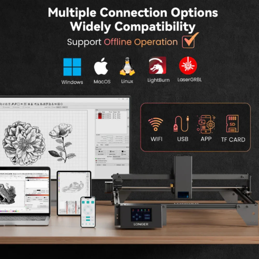 Compatibilité large Compatible avec LaserGRBL, LightBurn et prend en charge Windows 7 +, macOS et Linux. Formats de fichiers pris en charge: JPG, PNG, BMP, G-code, GIF, SVG, NC, GC, etc.