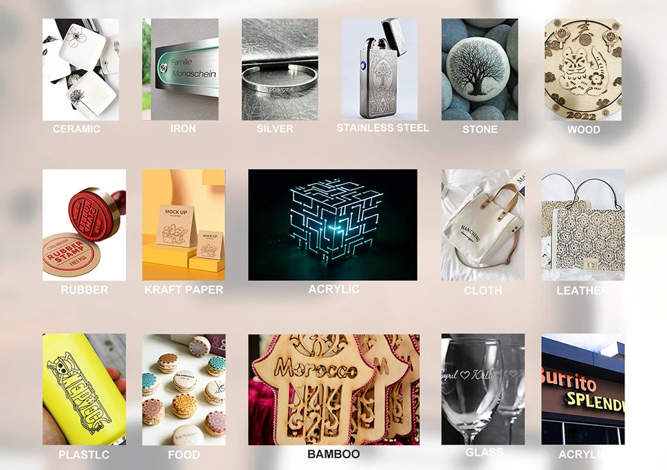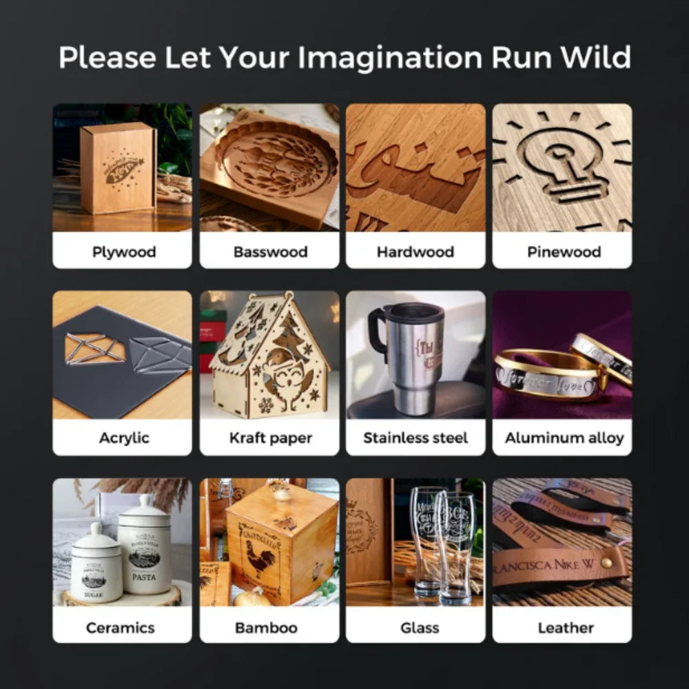 Supporte les matériaux de gravure: tout bois, papier, plastique, cuir, carte PCB, oxyde d'aluminium, placage non réfléchissant et métal laqué. Matériaux de coupe de soutien: Carton, tissu non-tissé, bois léger, matériel acrylique, panneau en plastique mince. (Impossible de graver: matériau bleu/violet/blanc/transparent, aluminium sans couche d'oxyde.)