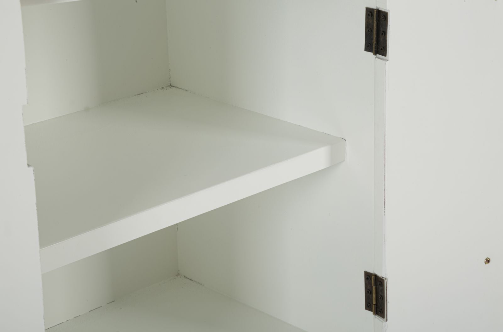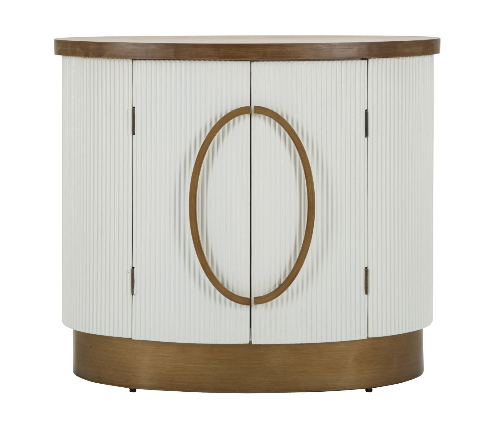 Mobile ovale in legno bianco con piano e inserti in legno marrone dal design arrotondato. Finemente decorato con linee in rilievo. Completo di 2 ante.