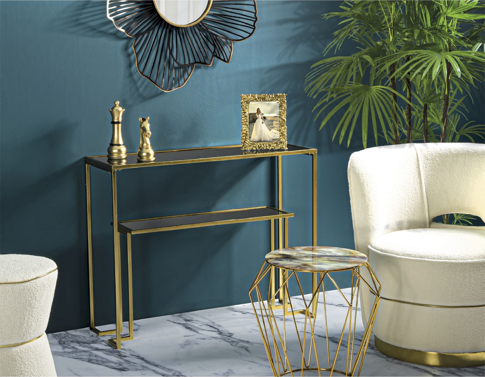 Console in metallo dorato dalle linee geometriche semplici ed essenziali con piano e ripiano inferiore in vetro.