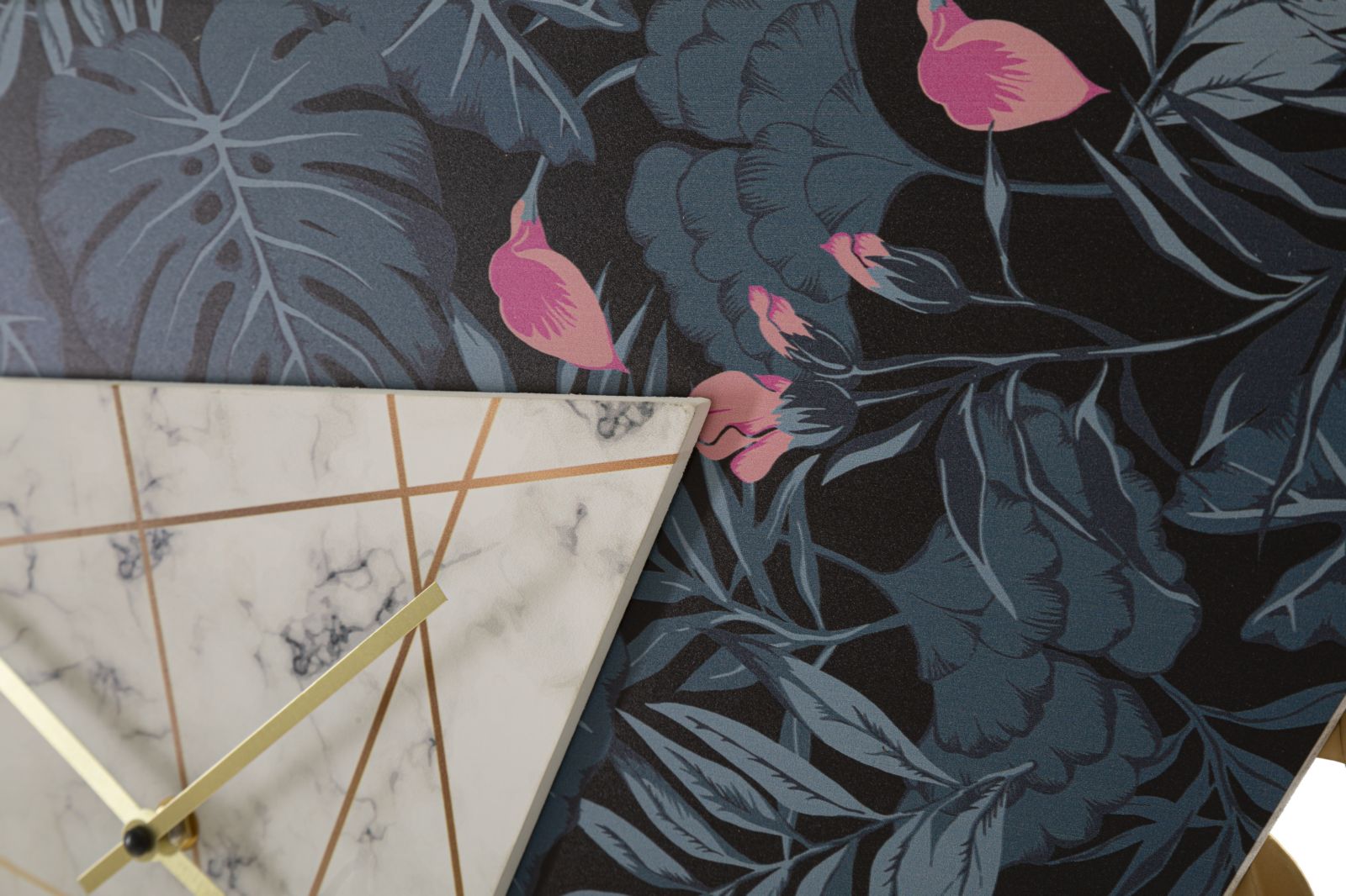 Orologio da parete composto da triangoli di varie misure sovrapposti tra loro e realizzati con decorazioni diverse che vanno a comporre un elegante contrasto. L'insieme ¨¨ impreziosito da un ramoscello dorato.
