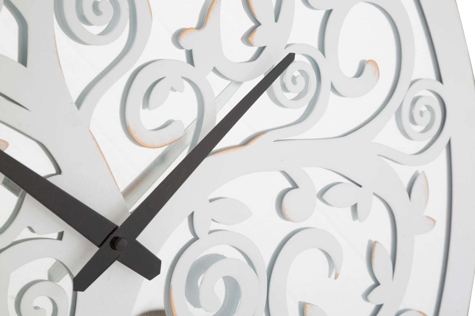 Elegante orologio rotondo da parete in metallo bianco e specchio. Il design ad albero richiama la natura e dona un tocco di classe ad ogni ambiente.