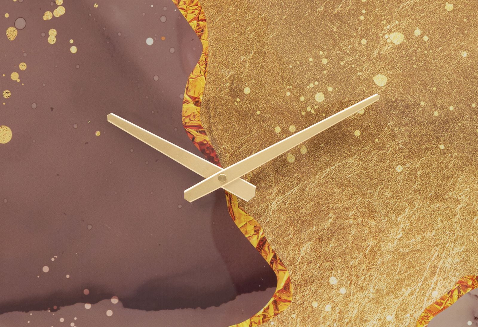 Orologio rotondo da parete con elegante cornice dorata e quadrante decorato con tonalit¨¤ vivaci e accese.