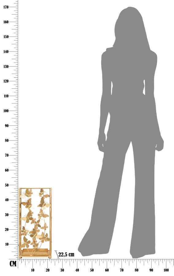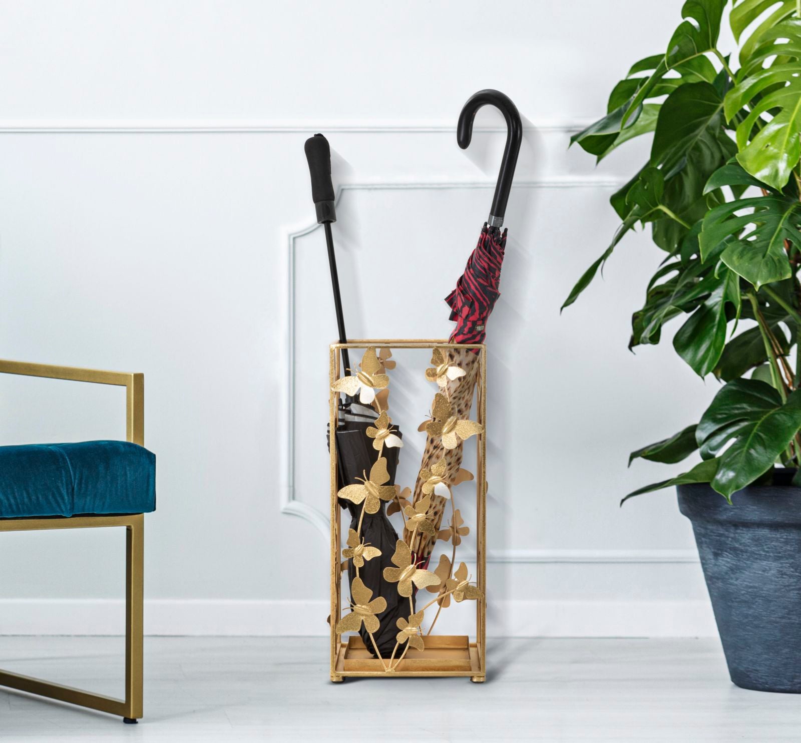 Elegante portaombrelli quadrato in metallo dorato con delicate farfalle decorative. Un tocco di classe e ricercatezza all'ingresso di casa tua.