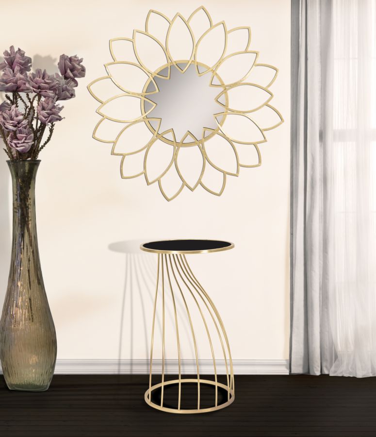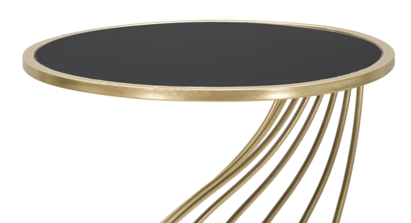 Tavolinetto portatelefono in metallo e vetro dalle linee sinuose e accattivanti. Il dorato abbinato al nero crea un forte impatto. Un elemento lussuoso e glam per la tua casa