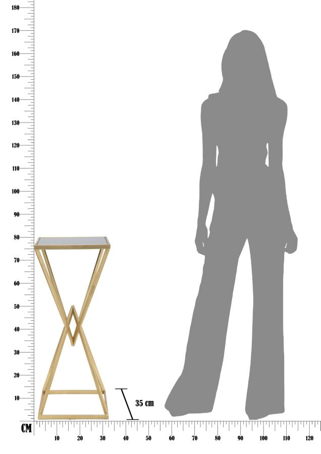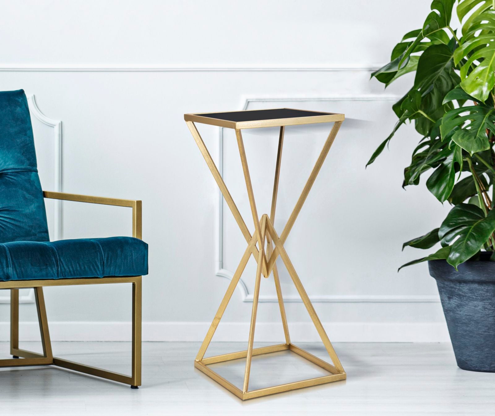 Tavolinetto porta telefono quadrato in metallo dorato e tessuto dalle linee geometriche ed ipnotiche. Elementi d'arredo che ricordano i lussuosi ambienti dell'Hotel Plaza di New York. Ricrea l'atmosfera magica del Grande Gatsby nel tuo interior