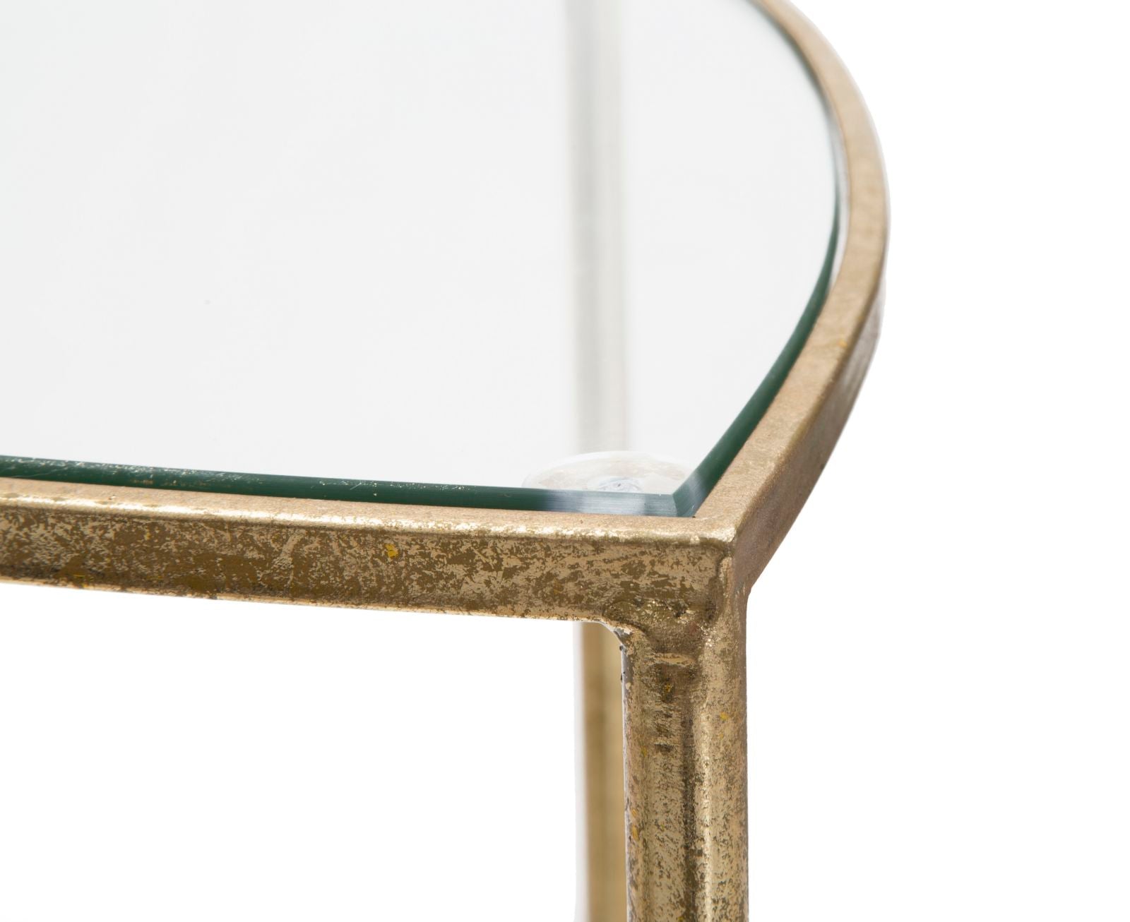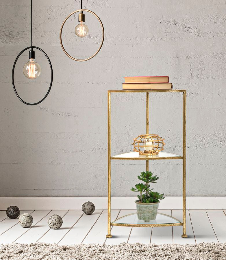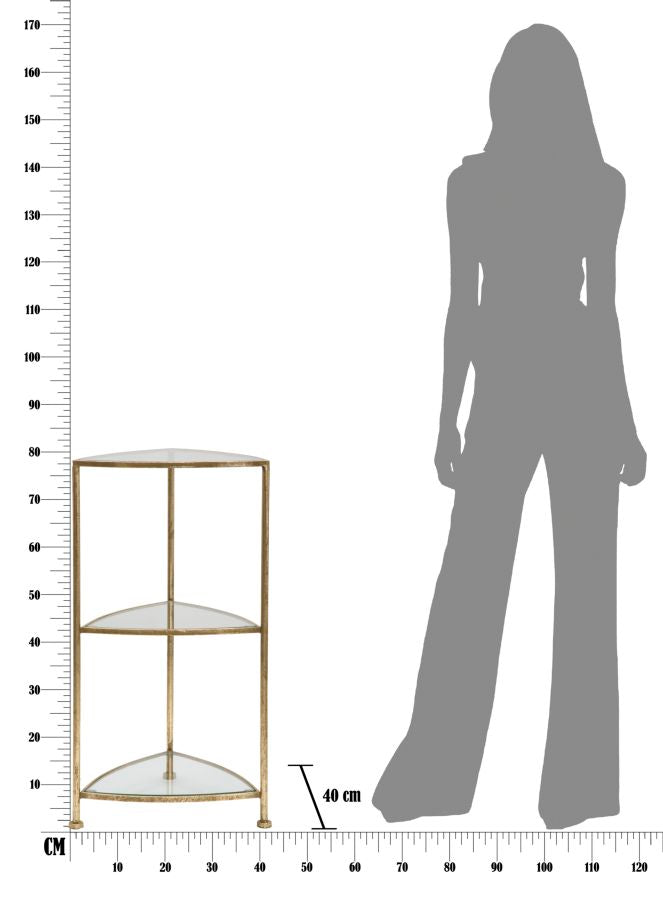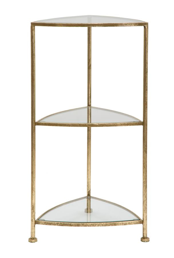 Mobiletto portatelefono in metallo dorato con 3 ripiani in specchio. La particolare forma triangolare con i lati arrotondati creano un effetto avvolgente e di gran classe.