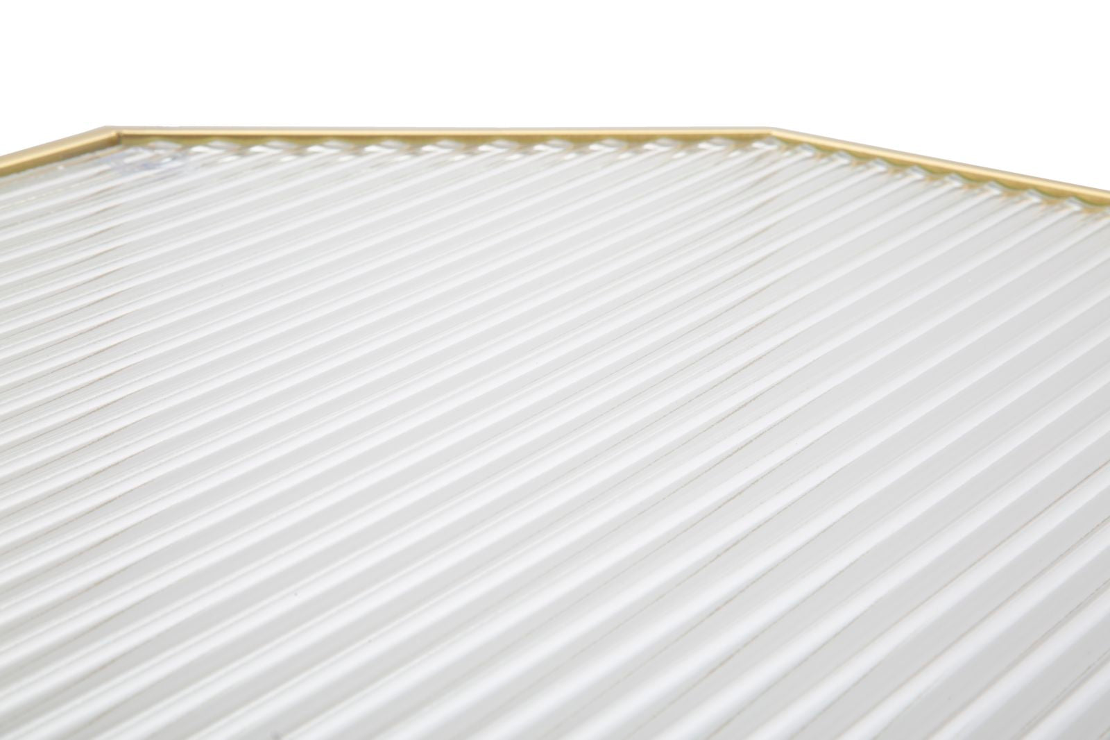 Coppia di tavolinetti porta telefono quadrati in metallo dorato dalle linee geometriche che creano un senso di profondit¨¤ Completi di piano in vetro finemente lavorato.
