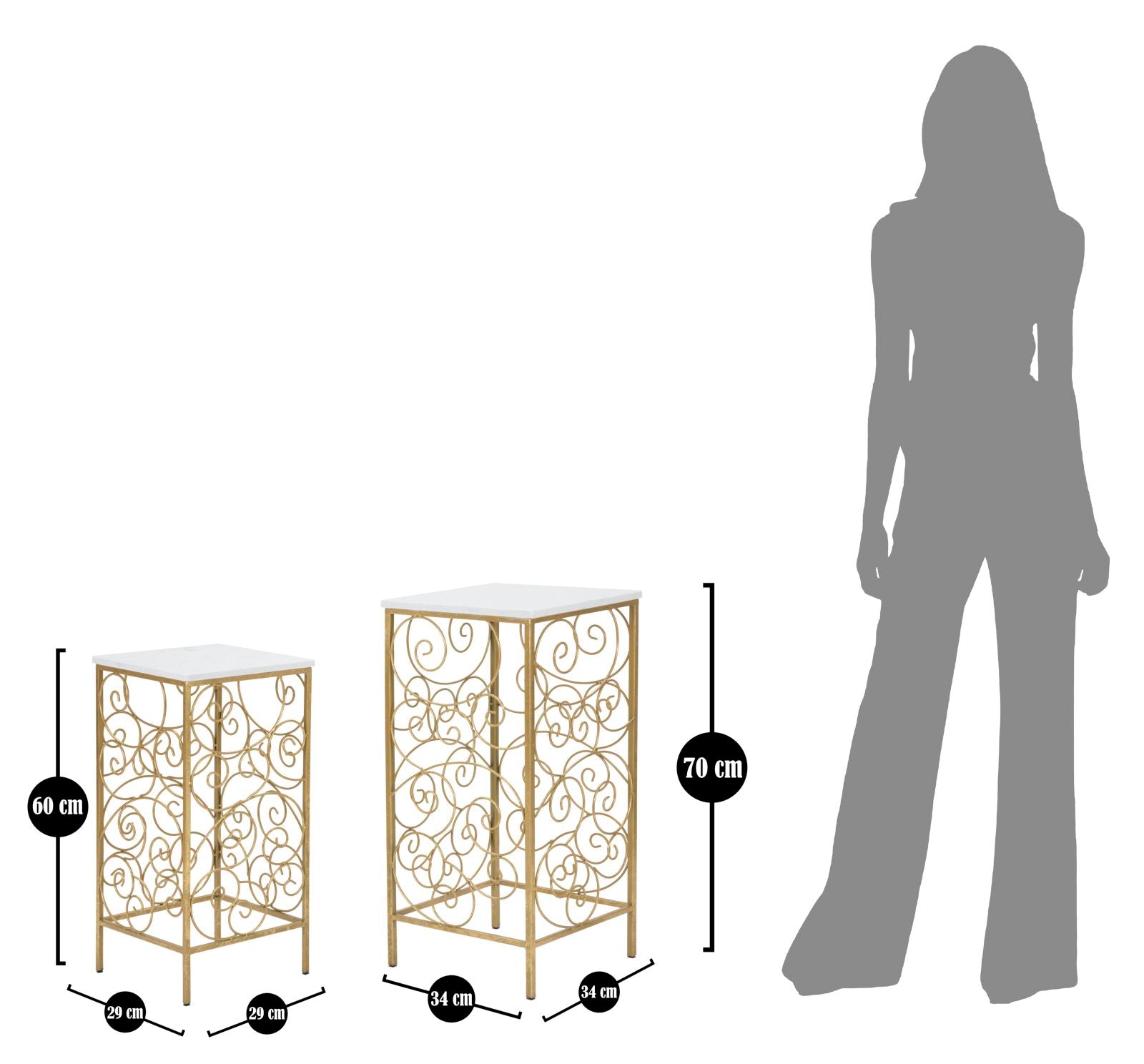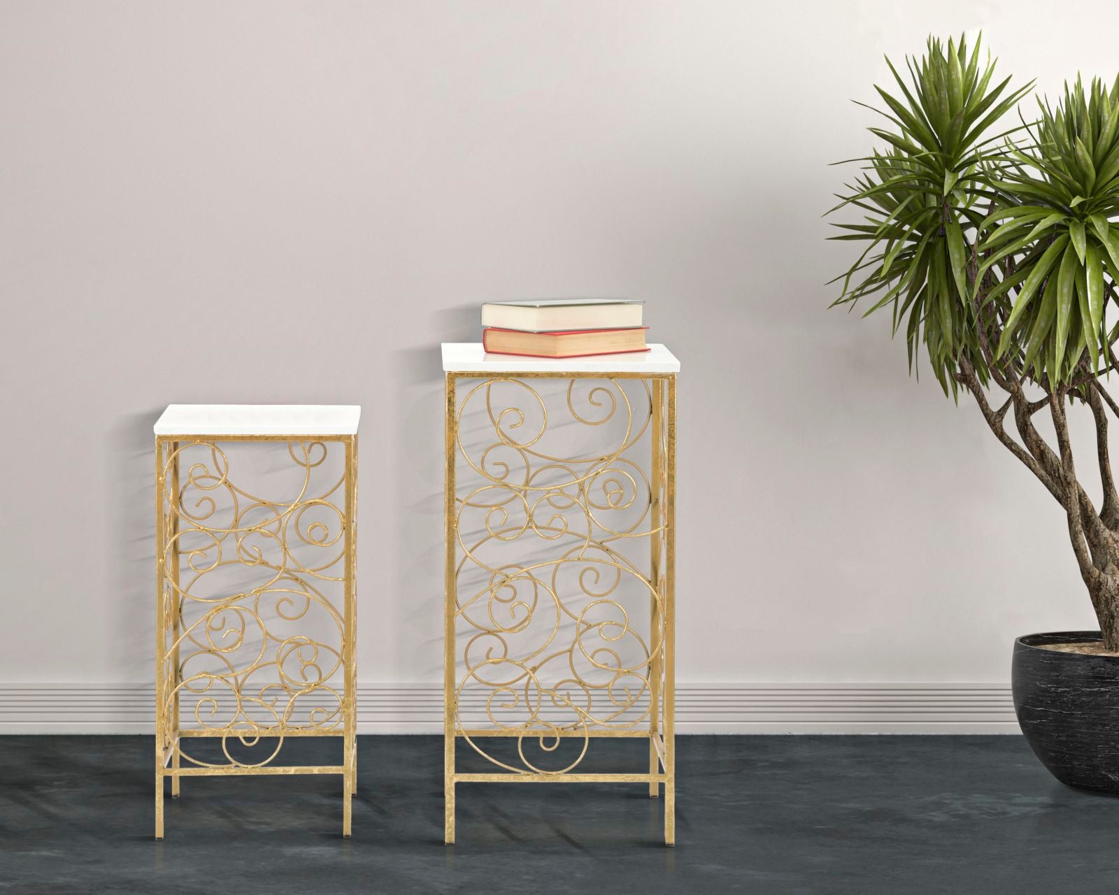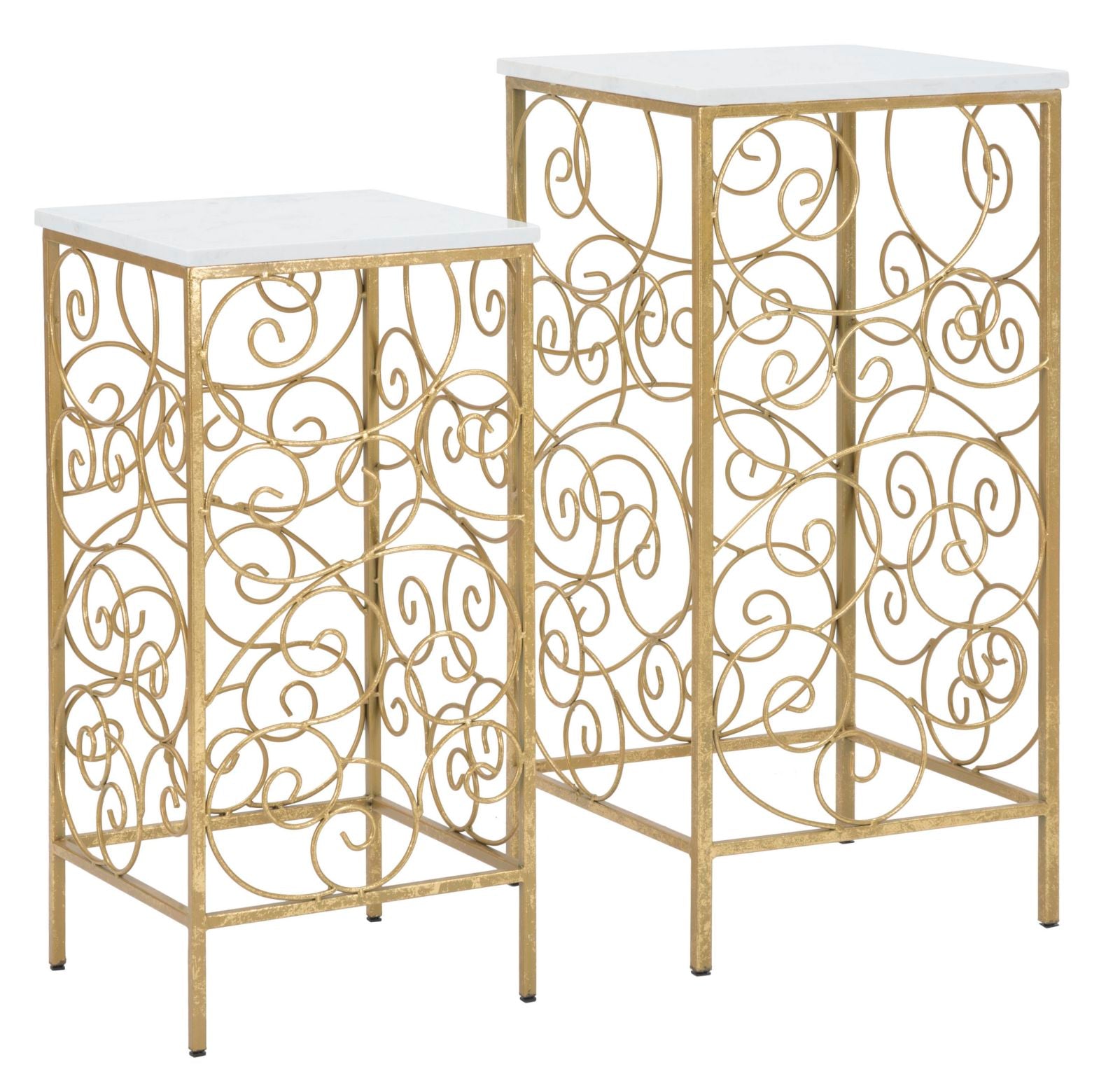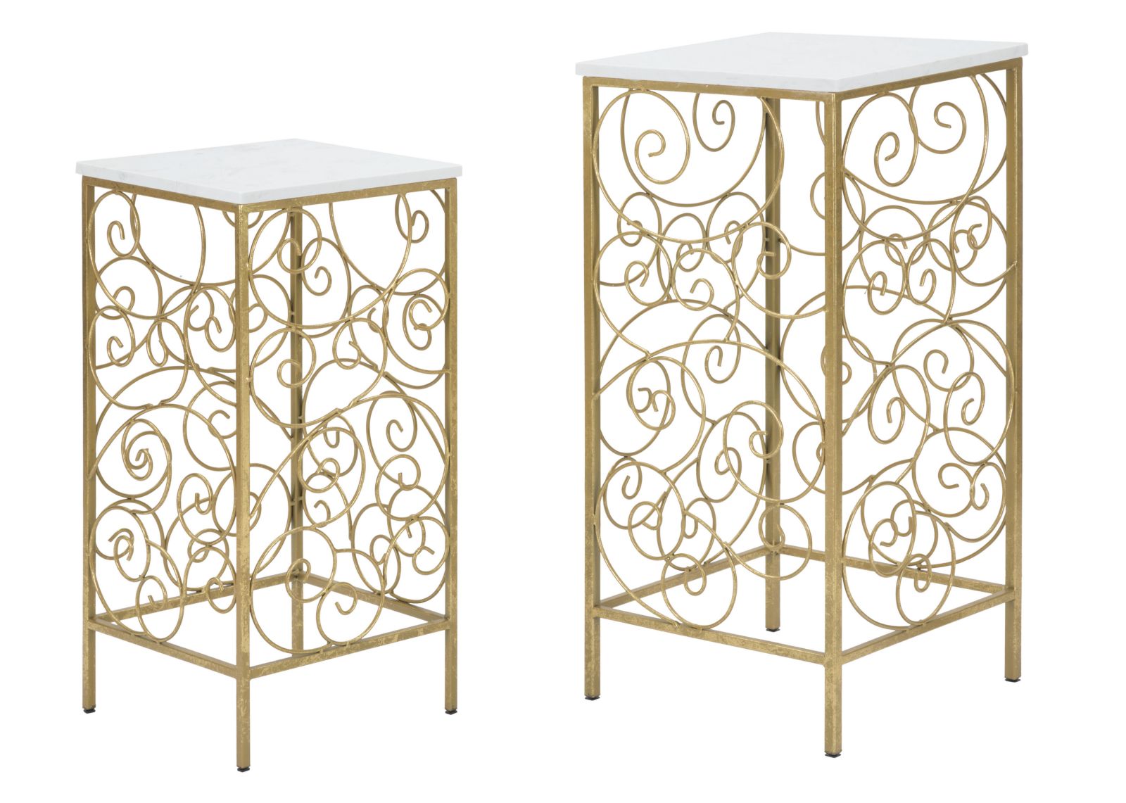 Coppia di tavolinetti quadrati in metallo dorato impreziositi dal piano in marmo bianco. Le particolari e morbide decorazioni geometriche donano un tocco di ricercatezza ad ogni ambiente.