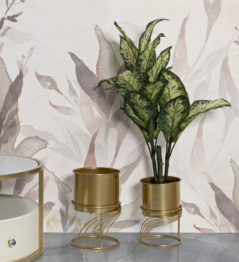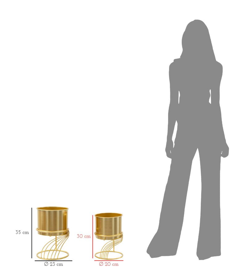 Set di due porta vasi in metallo dorato con linee a spirale che evocano movimento e armonia, perfetto per un tocco di classe nell'arredamento.