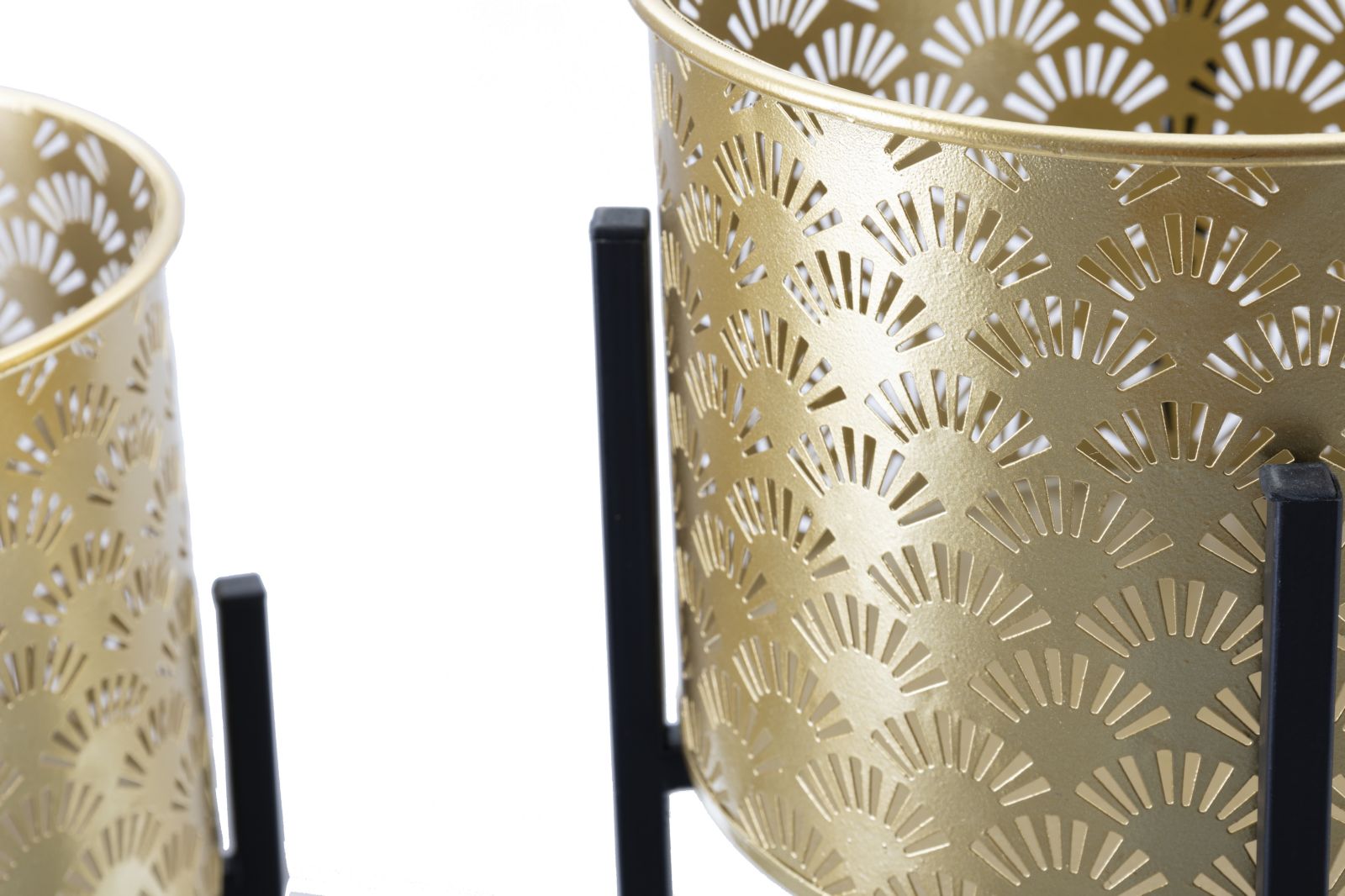 Coppia di portavasi rotondi in metallo dorato con intagli che richiamano le foglie, completi di piedistallo in metallo nero. Il portavasi ¨¨ removibile.
