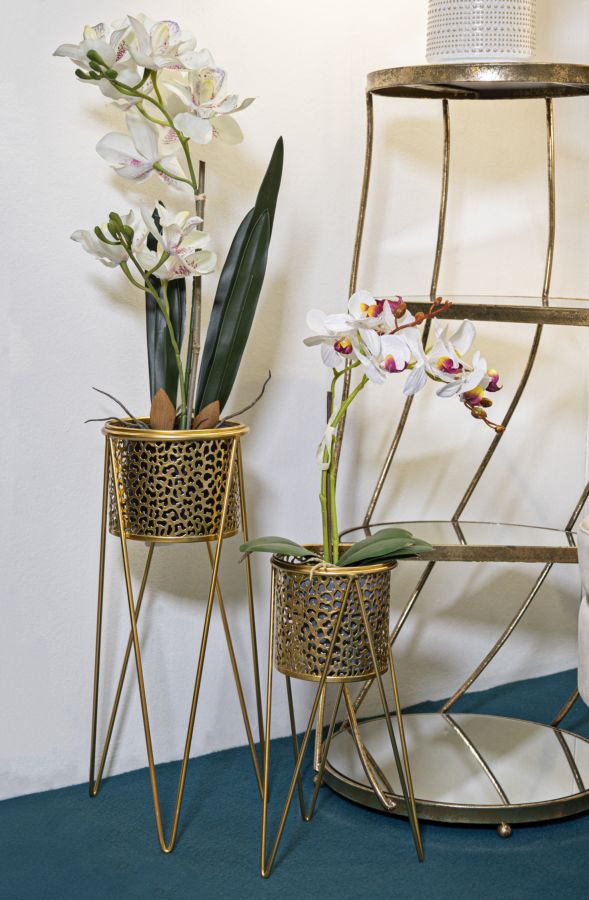 Coppia di portavasi in metallo dorato elegantemente decorati con intagli irregolari e arrotondati. Completi di supporto in metallo dorato. I vasi sono removibili dai supporti.