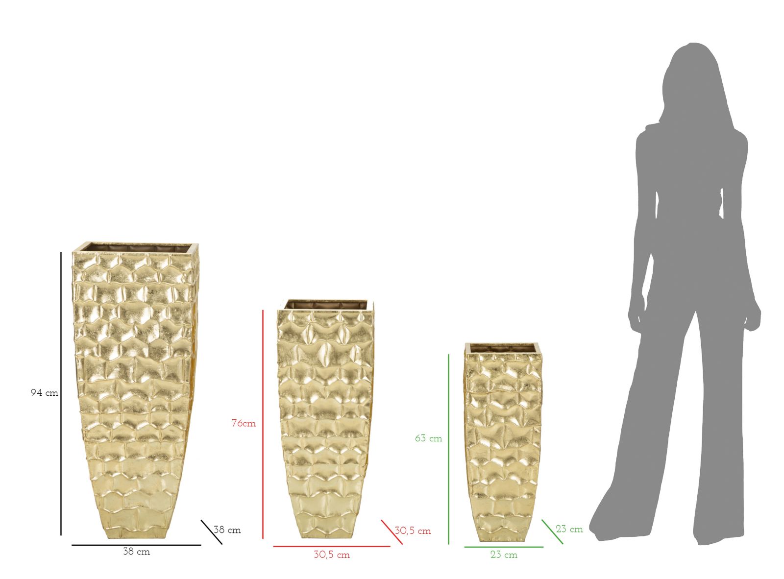 Set di 3 vasi quadrati in metallo dorato con eleganti decorazioni irregolari in rilievo.