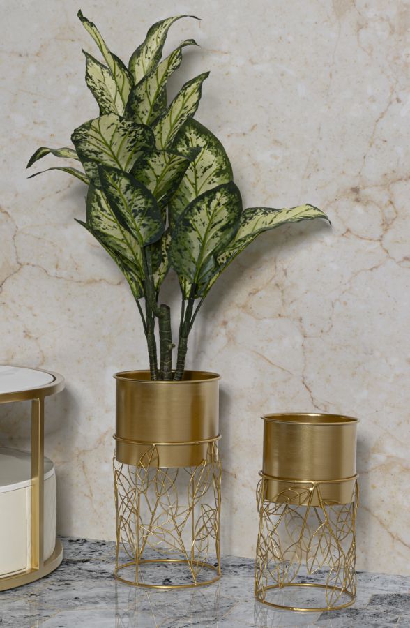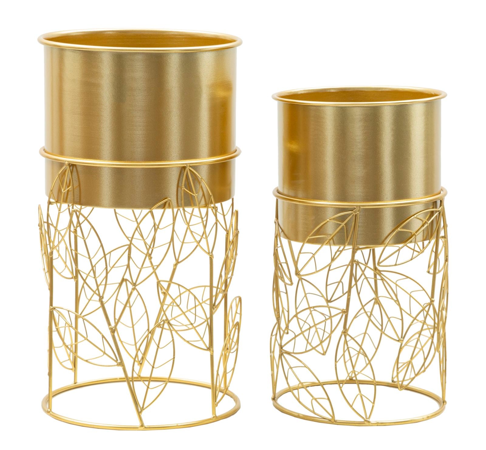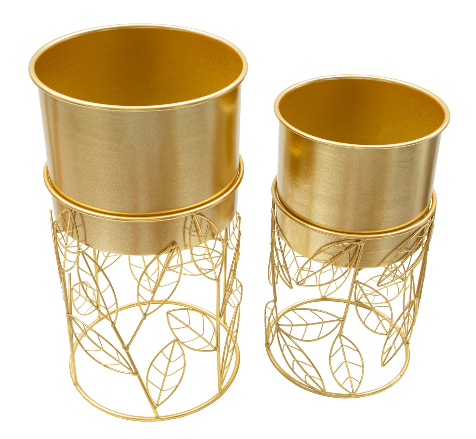 Set di due porta vasi in metallo dorato, rifinito con foglie intrecciate, perfetto per esaltare la bellezza delle piante con stile.