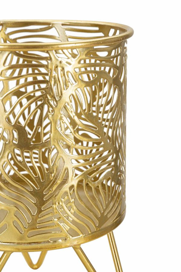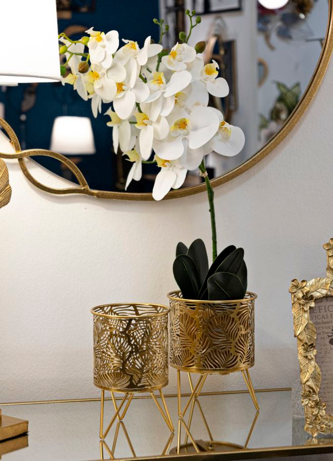 Coppia di portavasi in metallo dorato elegantemente decorati con intagli che richiamano le foglie. Completi di supporto in metallo dorato. I vasi sono removibili dai supporti.