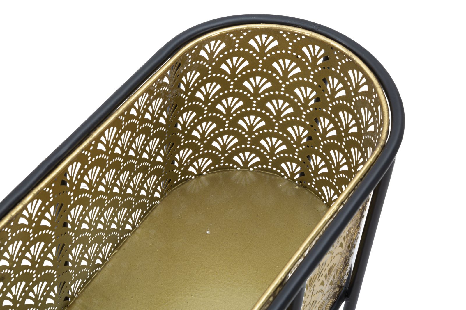 Portavasi ovale in metallo dorato finemente intagliato con piedistallo in metallo nero. Le linee morbide e sinuose donano un tocco di armonia ad ogni ambiente.