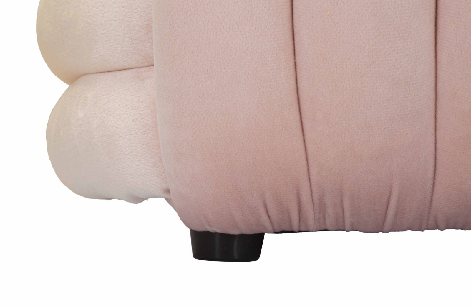 Panca annodata in velluto rosa evoca calore e lusso, invitando al relax con una sensazione accogliente e una nota di eleganza vibrante.