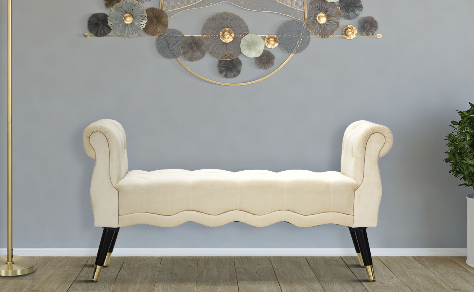 Panca in legno e velluto crema. Maestose sedute dalla finitura dorata che si ispirano ai camerini delle grandi dive di Hollywood. Ideali da collocare in camera da letto o in salotto per sentirsi delle star.