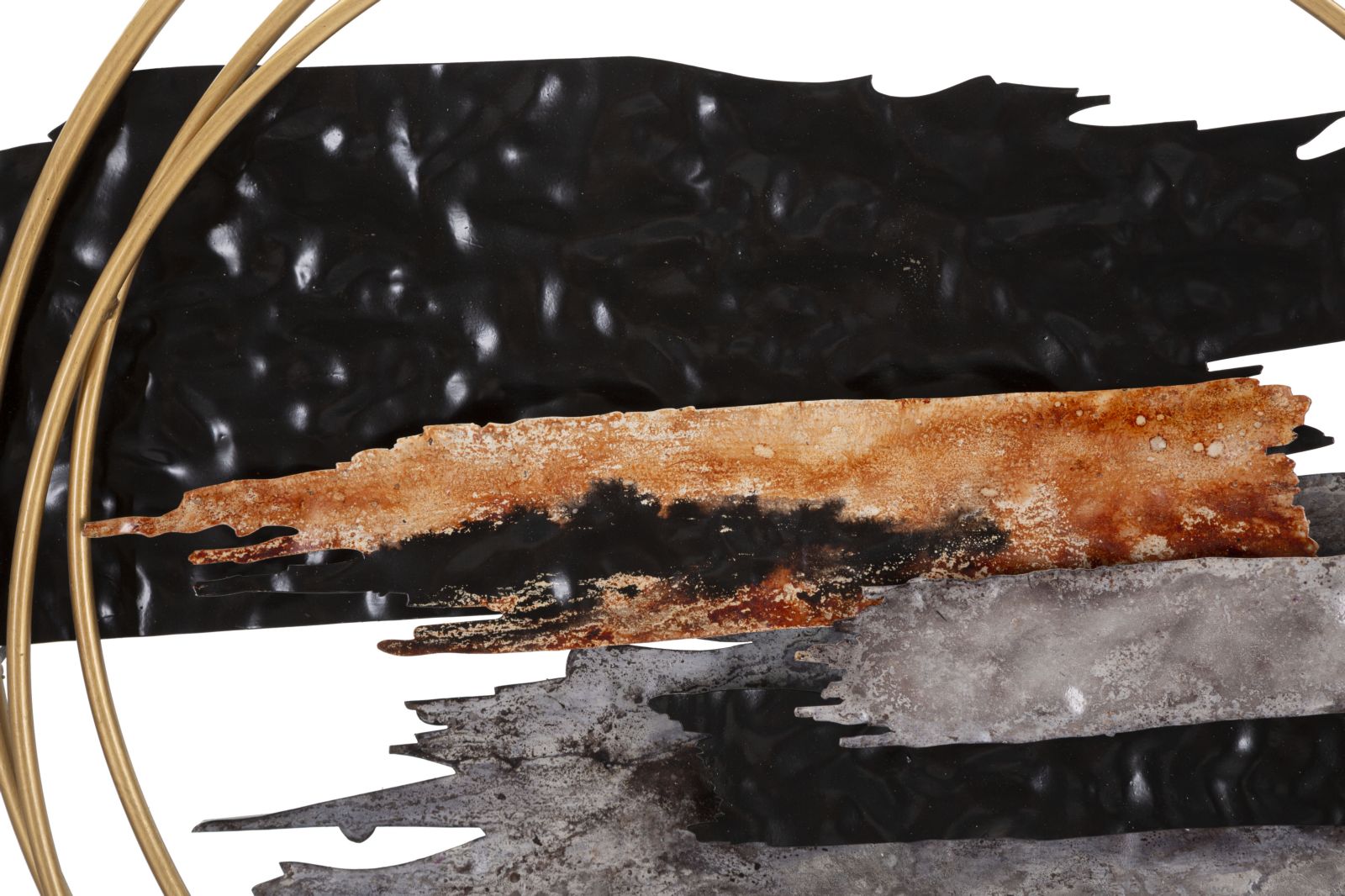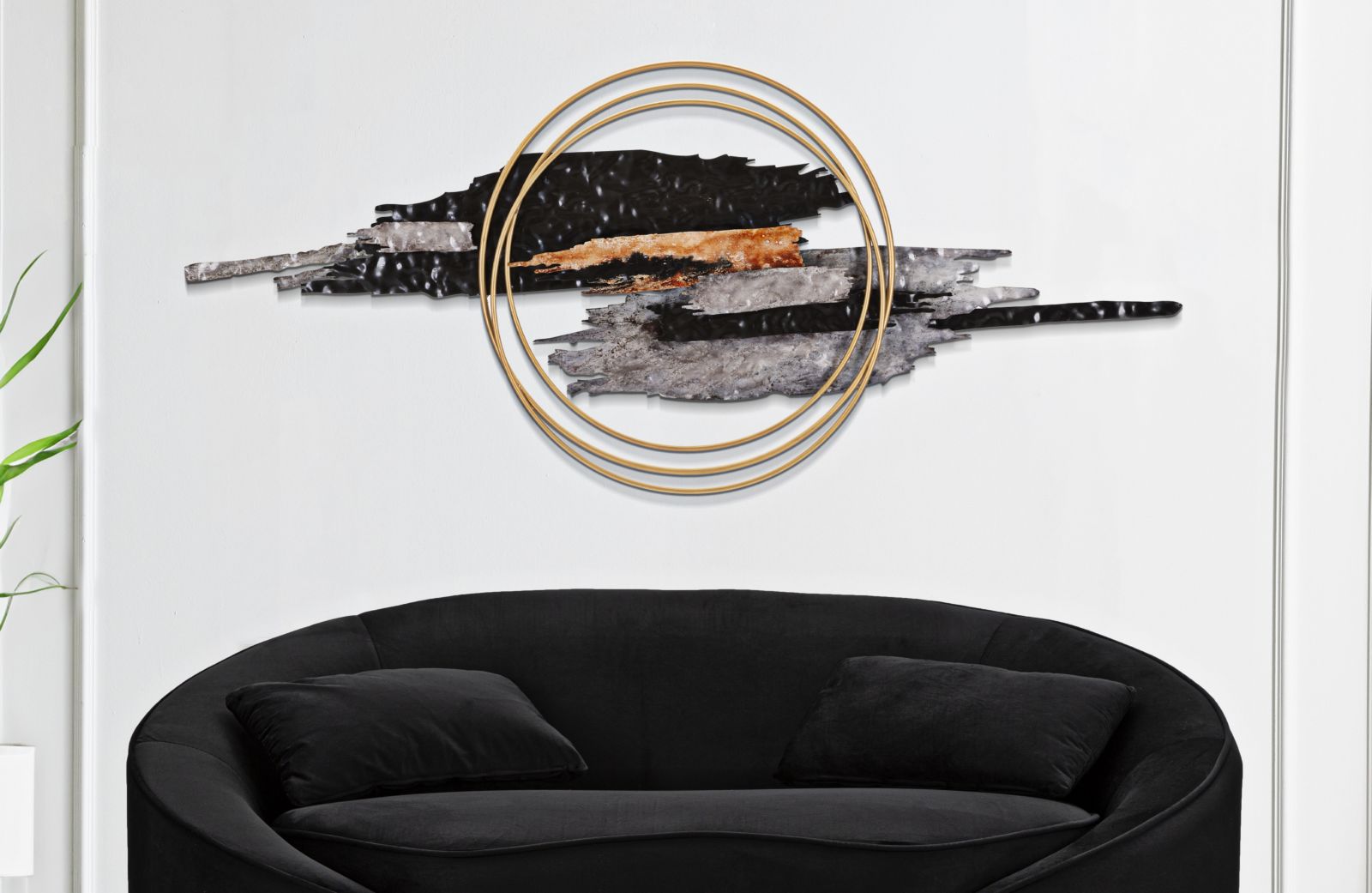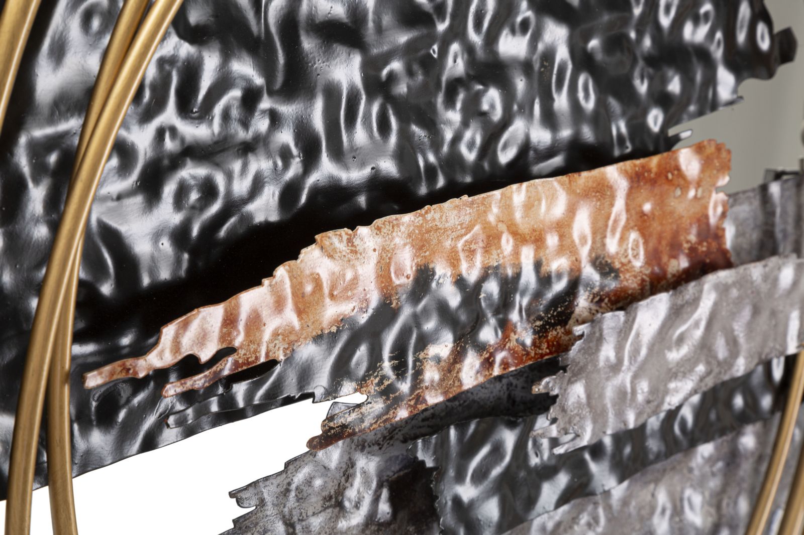 Pannello decorativo 3D da parete in metallo dal decoro astratto in un doppia cornice in metallo dorato.
