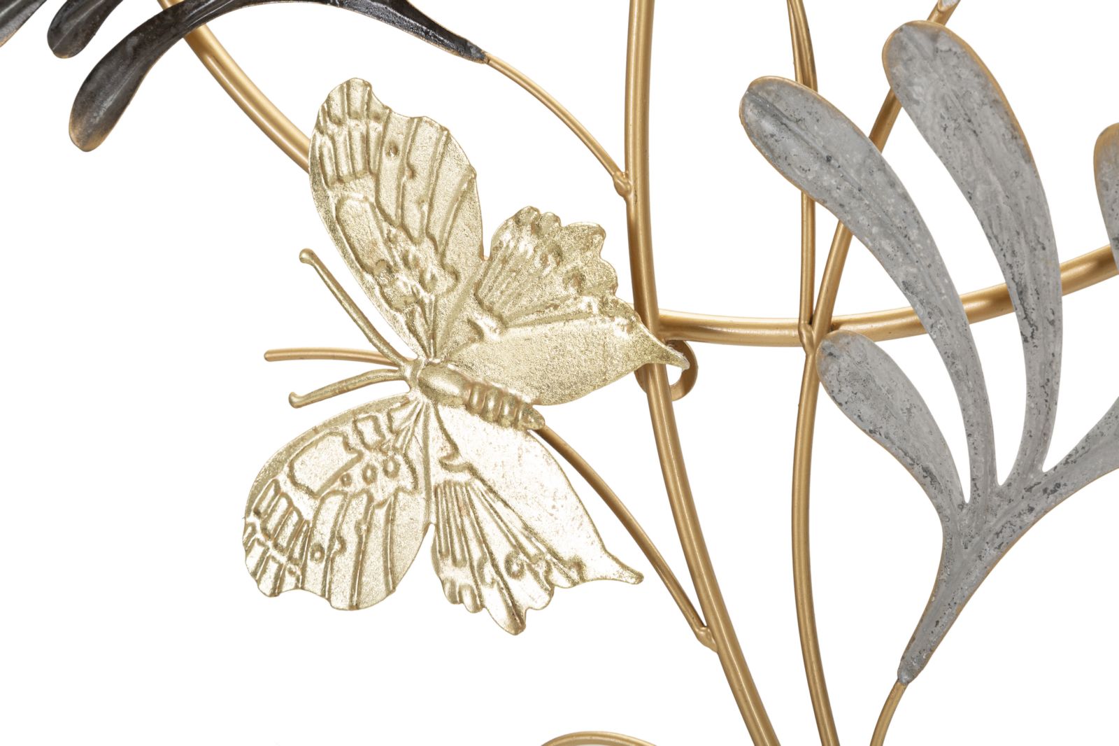 Pannello decorativo 3D da parete in metallo a forma di ramo con foglie stilizzate racchiuso in una cornice rotonda dorata.