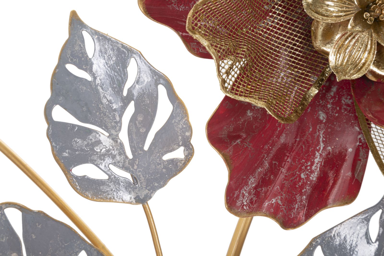 Pannello decorativo 3D da parete in metallo raffigurante dei fiori dai colori accesi e delle foglie.