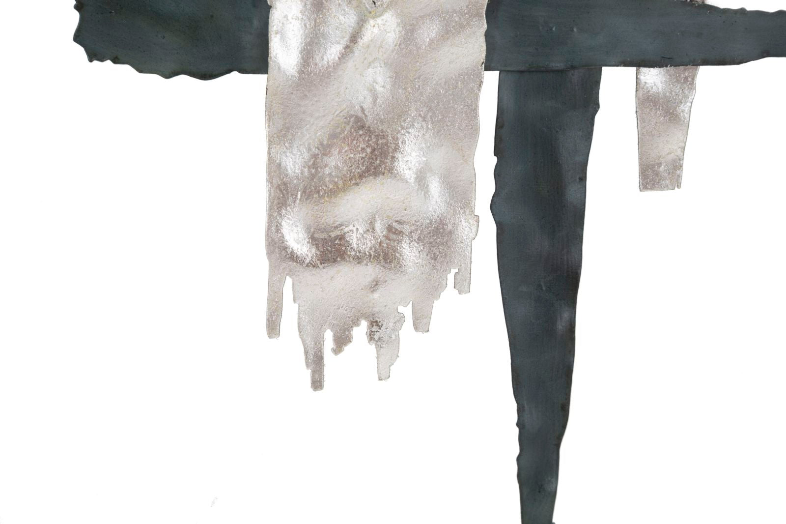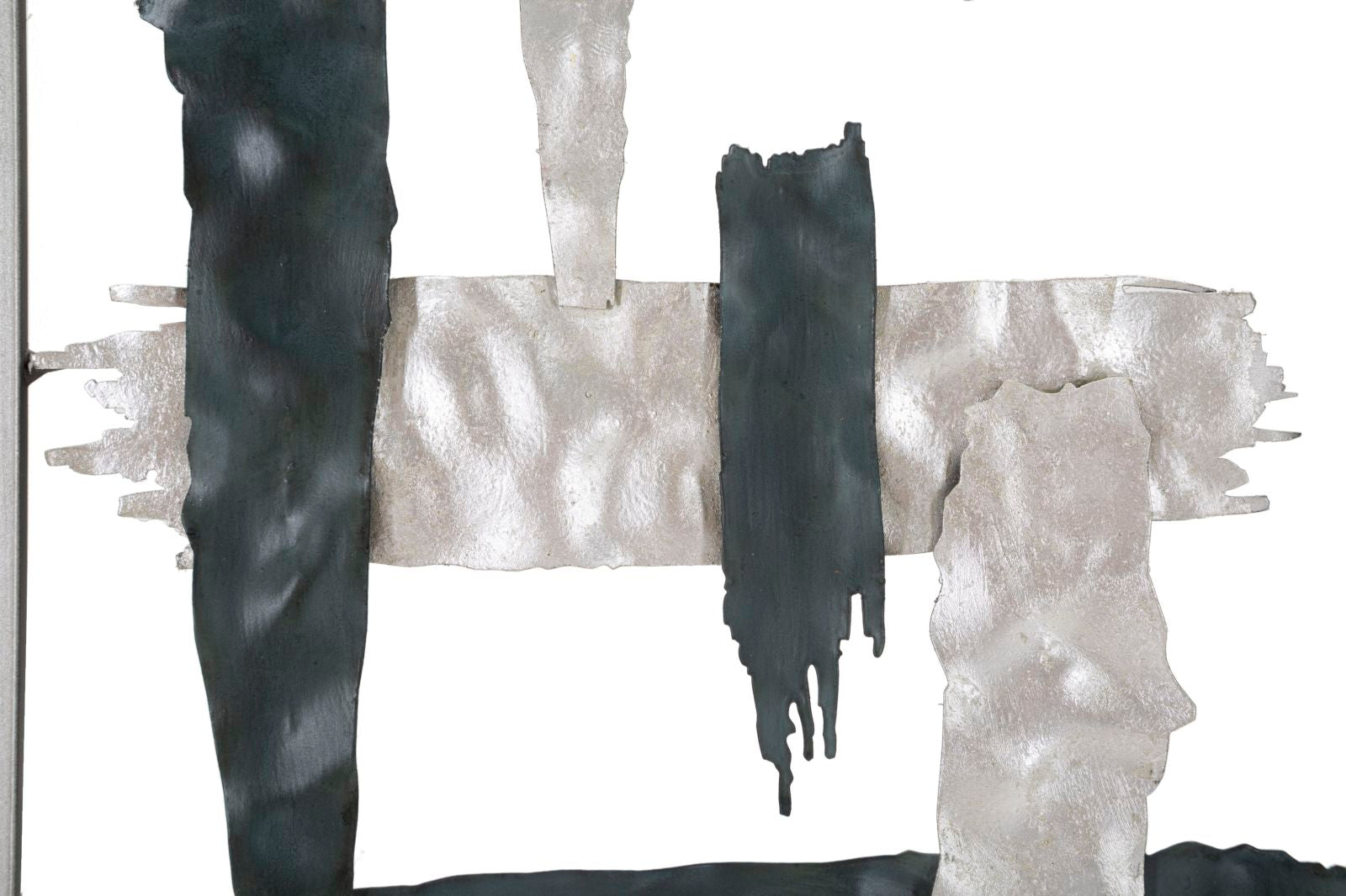 Pannello decorativo 3D da parete in metallo composto da figure astratte in un'elegante cornice rettangolare.