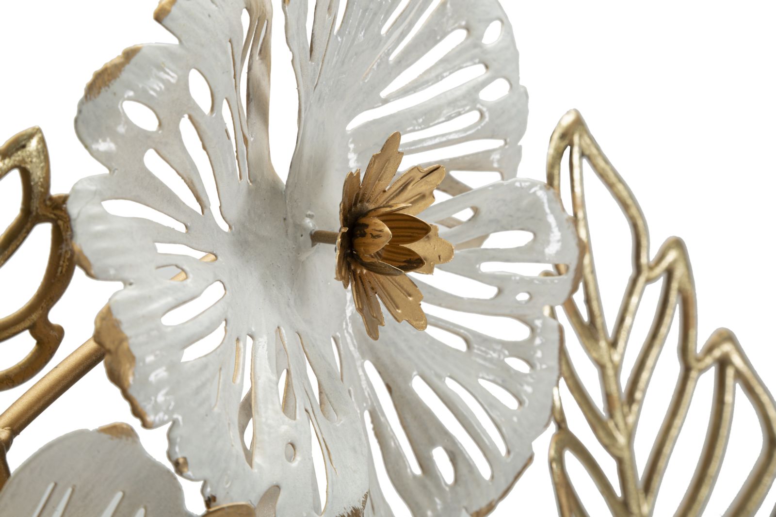 Pannello decorativo 3D da parete in metallo composto da rami e foglie dorate con fiori bianchi e dorati.