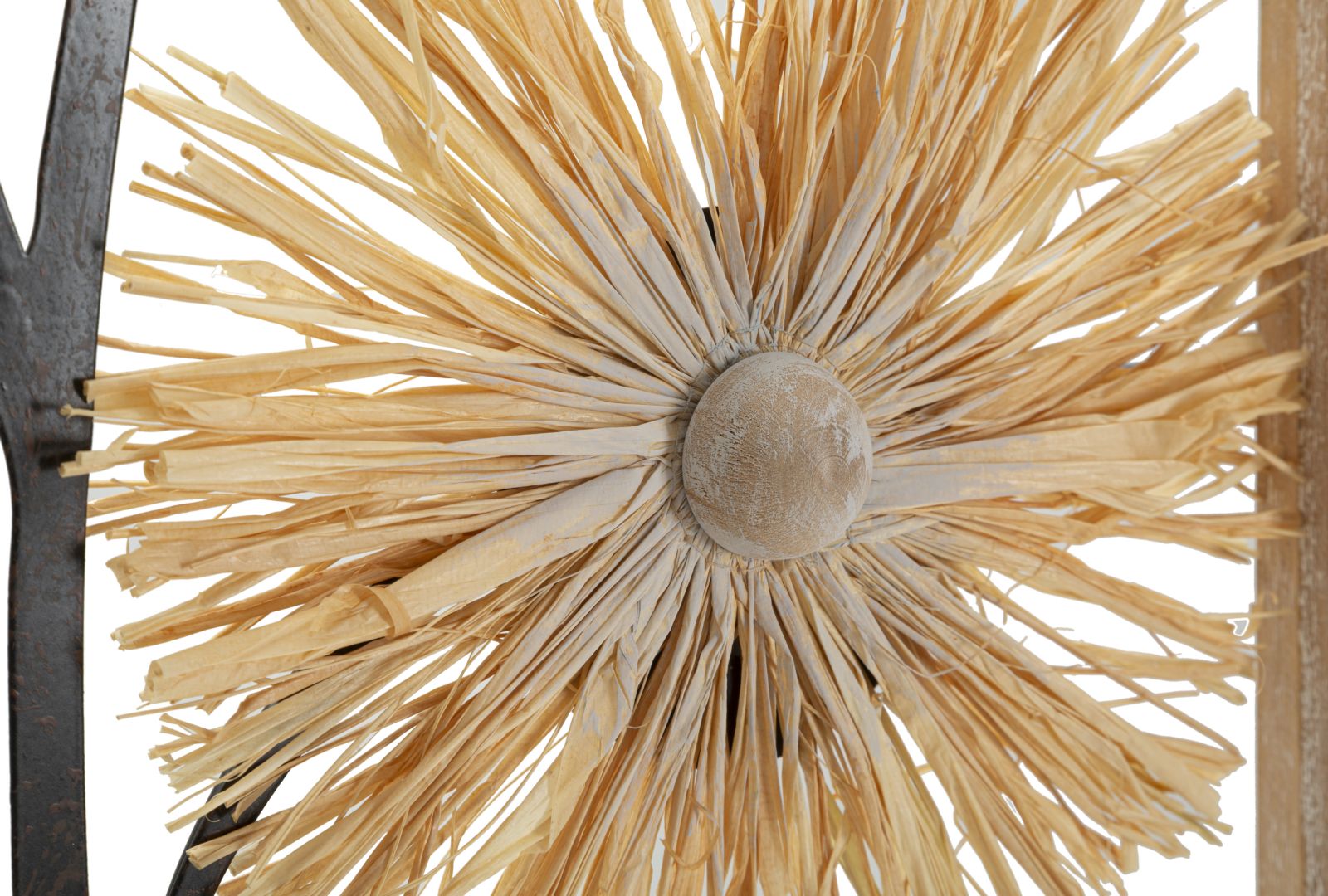 Pannello decorativo 3D da parete in metallo e legno composto da un vaso di fiori racchiusi in una cornice rettangolare in legno.