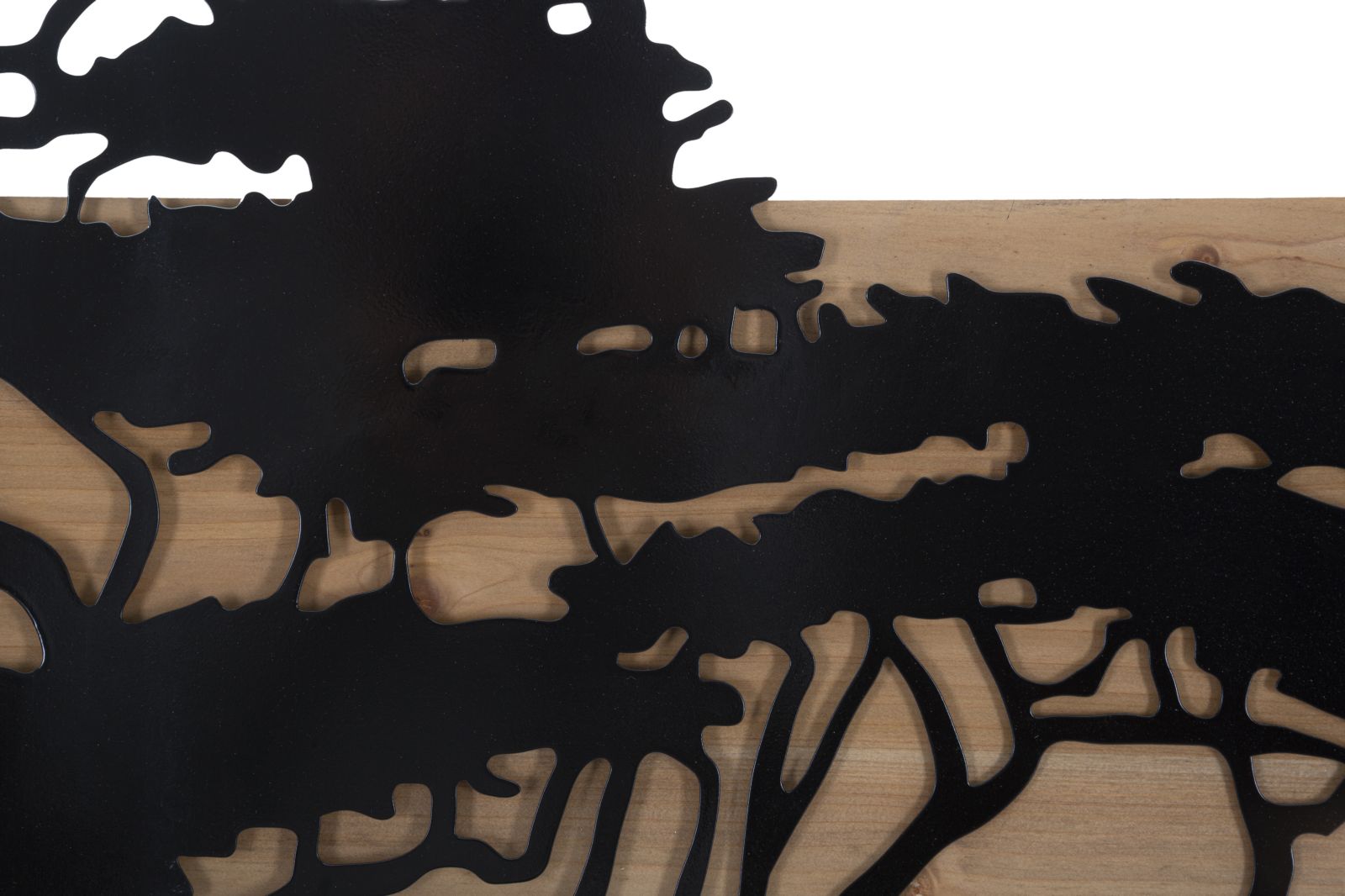 Set di 3 pannelli decorativi 3D da parete in metallo e legno che vanno a comporre l'immagine di un albero che richiama la savana.
