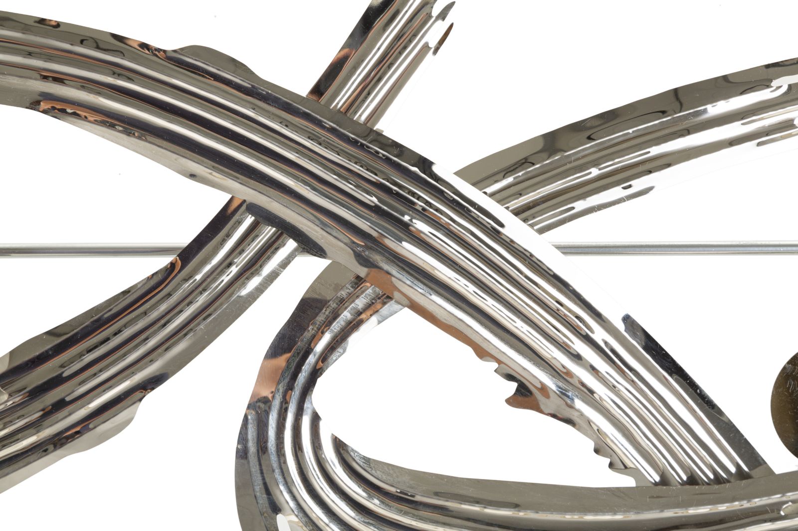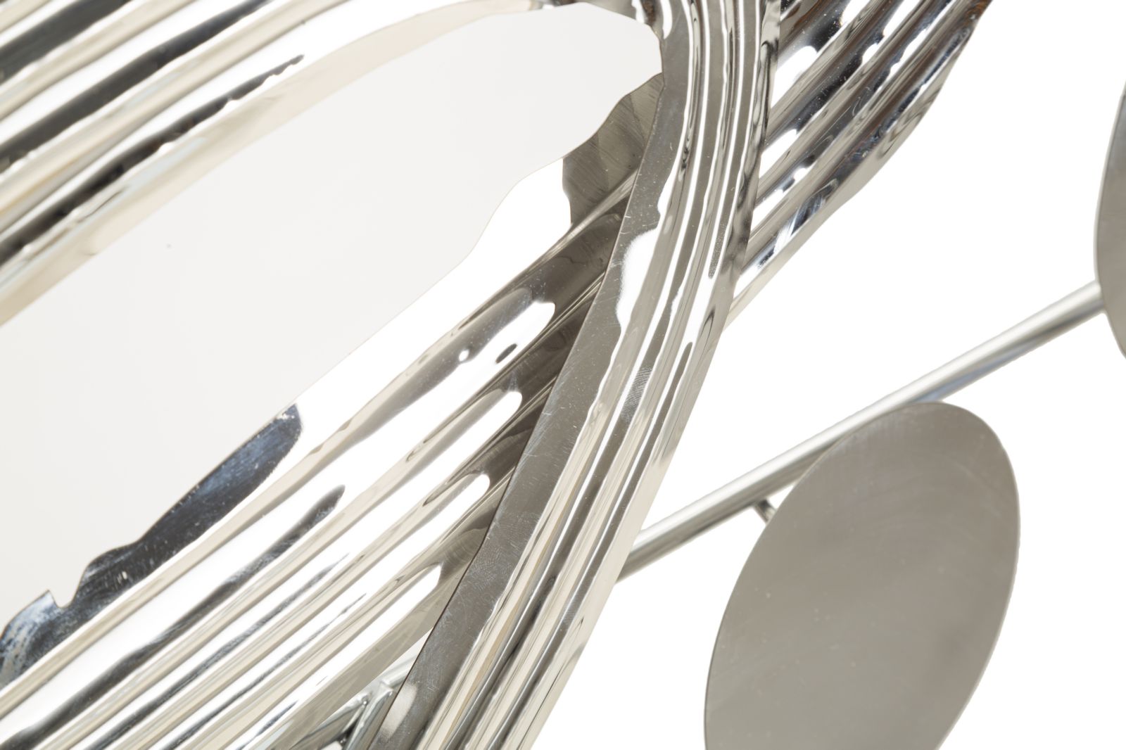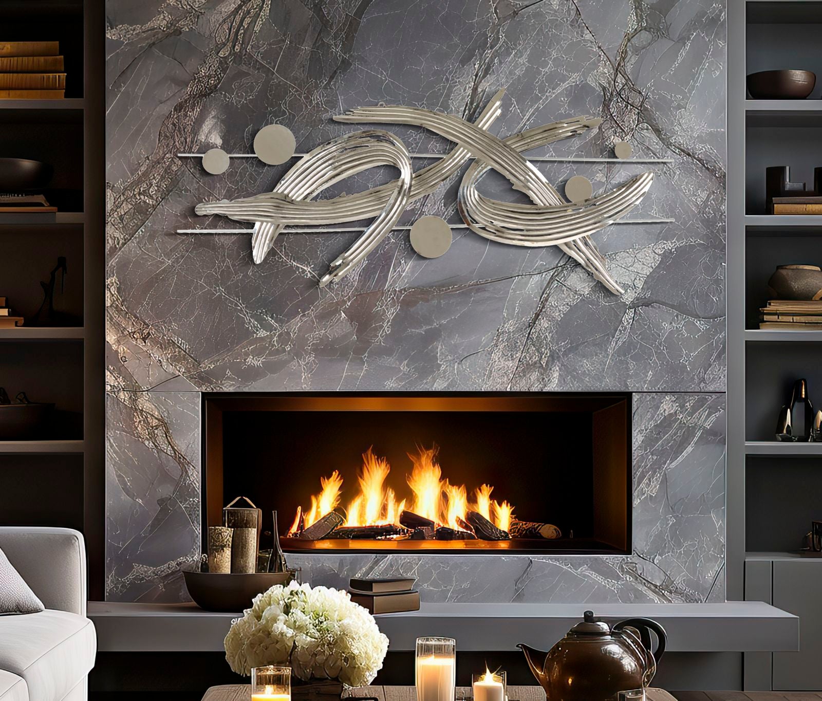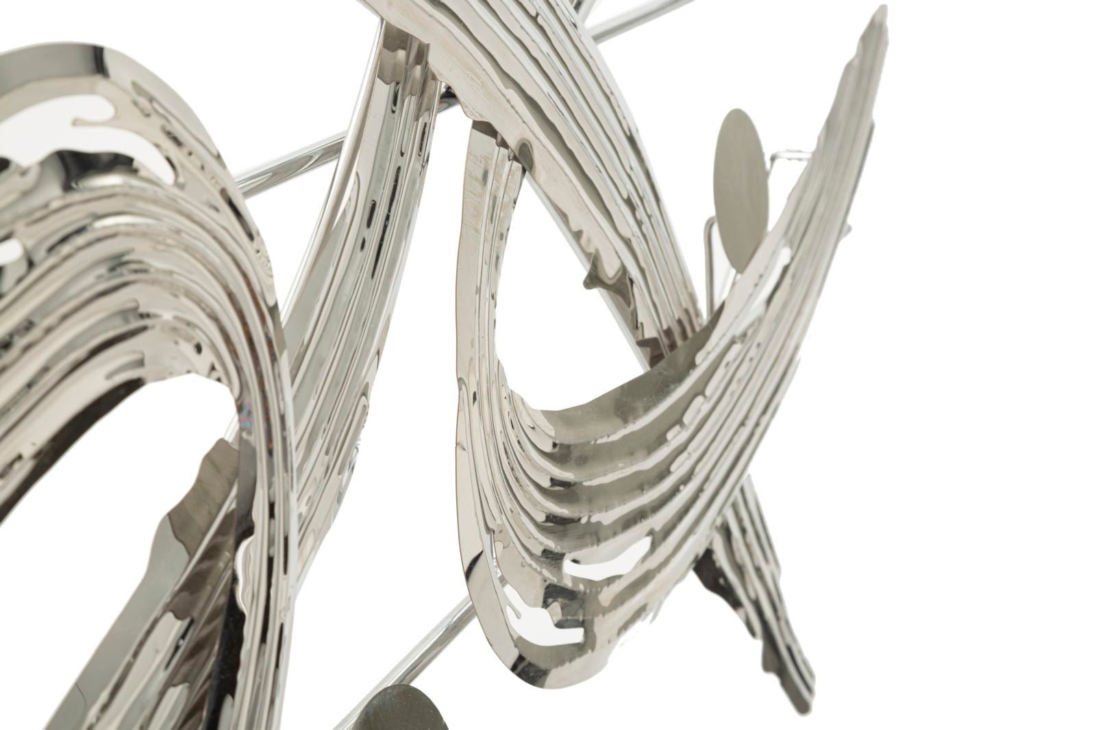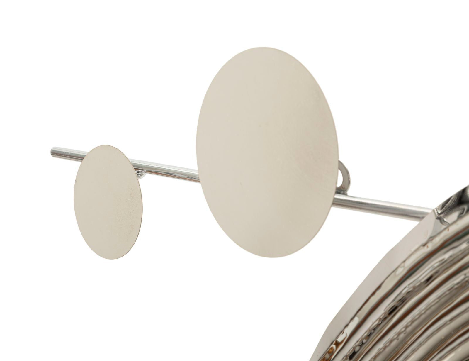 Pannello decorativo 3D da parete in metallo argento, con linee che esaltano l'equilibrio dinamico dell'arte moderna.