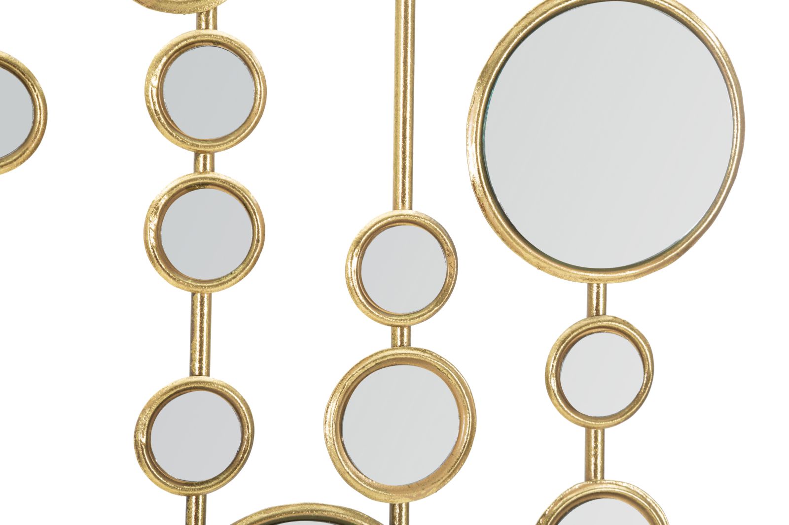 Pannello decorativo 3D dorato dal design geometrico composto da un insieme di specchietti rotondi di varie dimensioni.