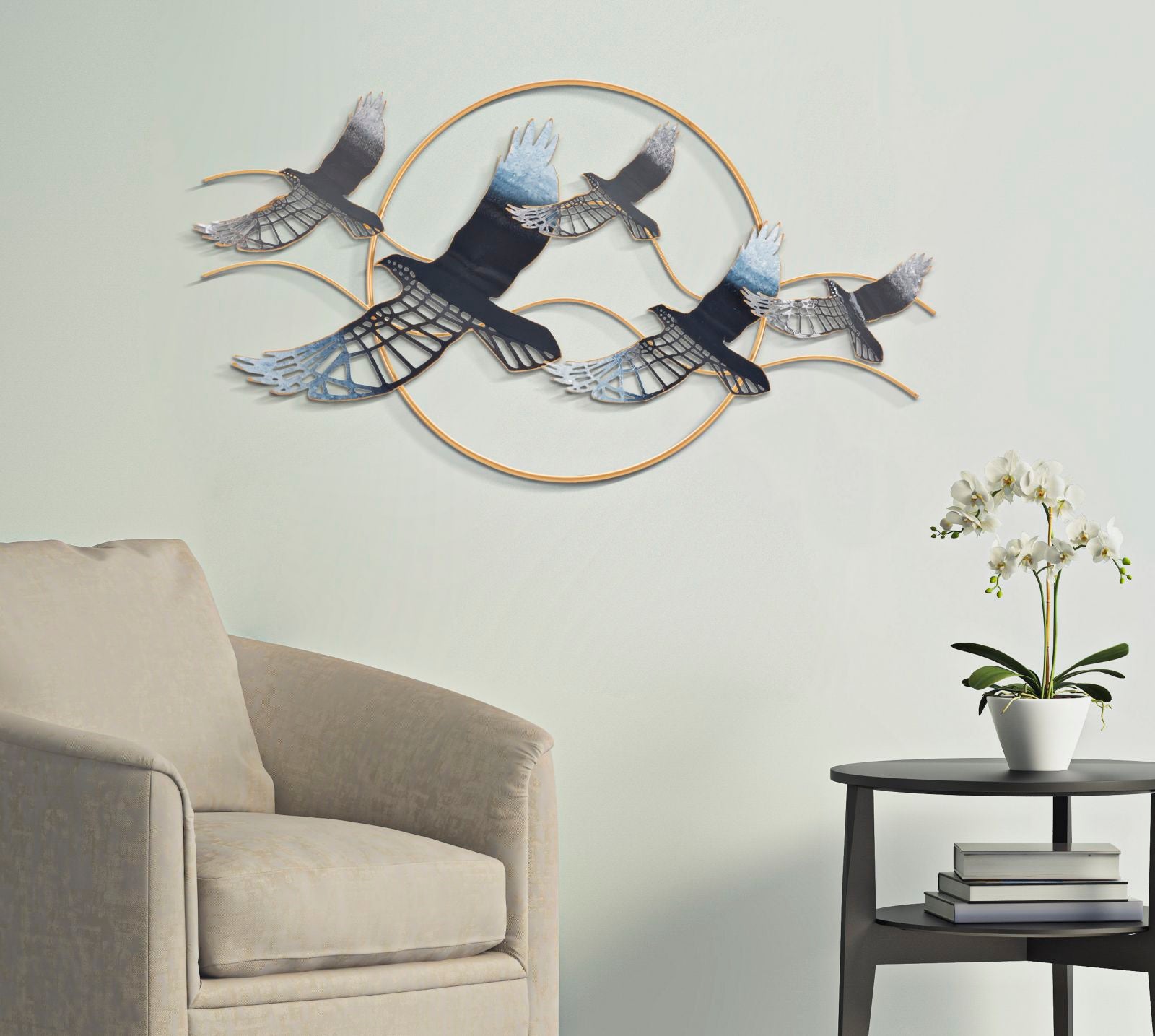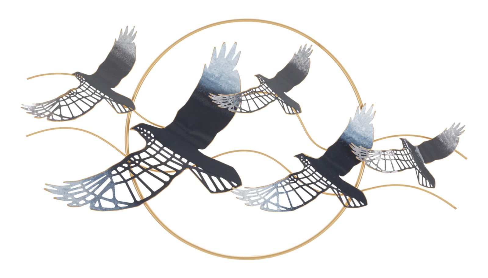 Pannello decorativo 3D da parete in metallo raffigurante degli uccelli in volo di vari colori con elegante cornice rotonda in metallo dorato.