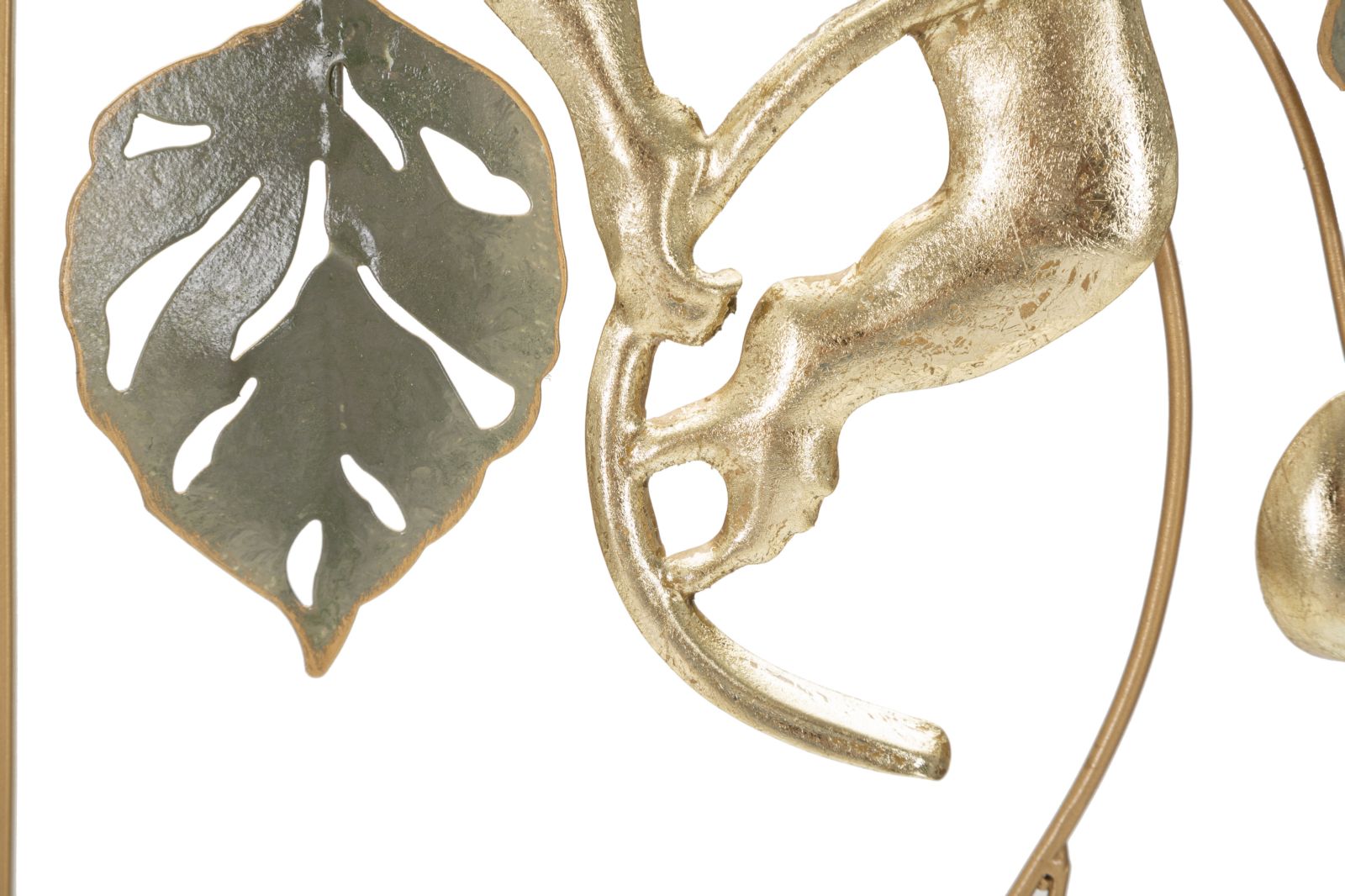 Pannello decorativo 3D da parete in metallo composto da una scimmia dorata su rami con foglie verdi in un'elegante cornice rettangolare con gli angoli smussati.
