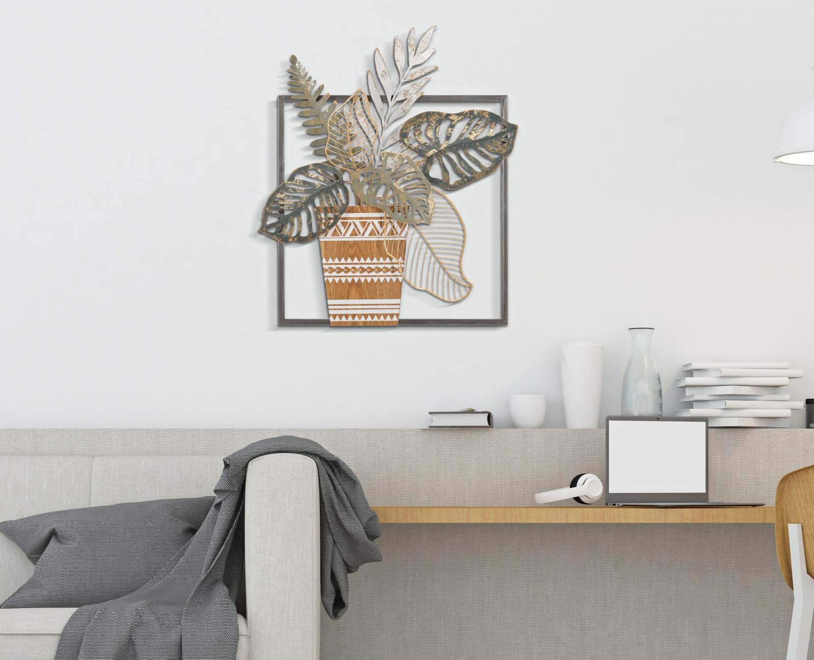 Pannello decorativo 3D da parete in metallo raffigurante un vaso con foglie racchiuso in una cornice quadrata.