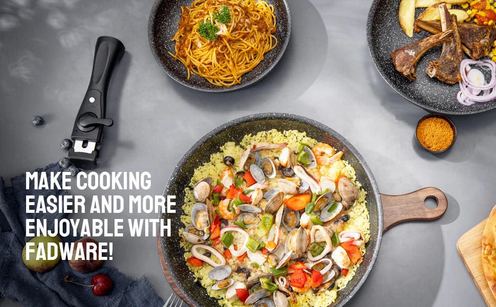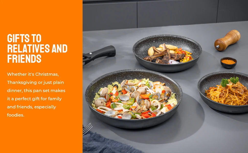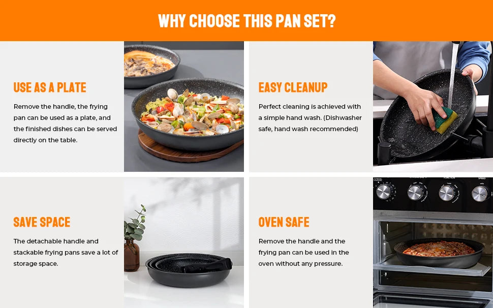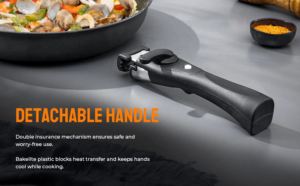 CE QUI EST INCLUS-PoÄÇles ½Ç frire de 20cm, 24cm et 28cm avec 1 poign¹Èe d¹Ètachable, ajoutant de la polyvalence ½Ç la cuisine et au stockage quotidiens.