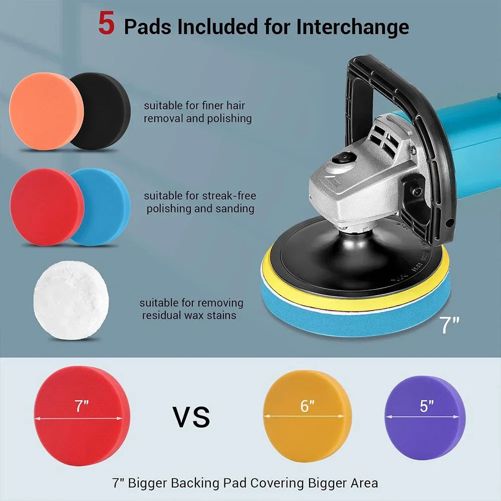Cette polisseuse de voiture est livr¹Èe avec un fond de panier Velcro qui facilite le changement des diff¹Èrents tampons de polissage en une seconde. L'ensemble complet comprend cinq tampons de polissage en mousse de 7 pouces et trois tampons de polissage en laine de 7 pouces