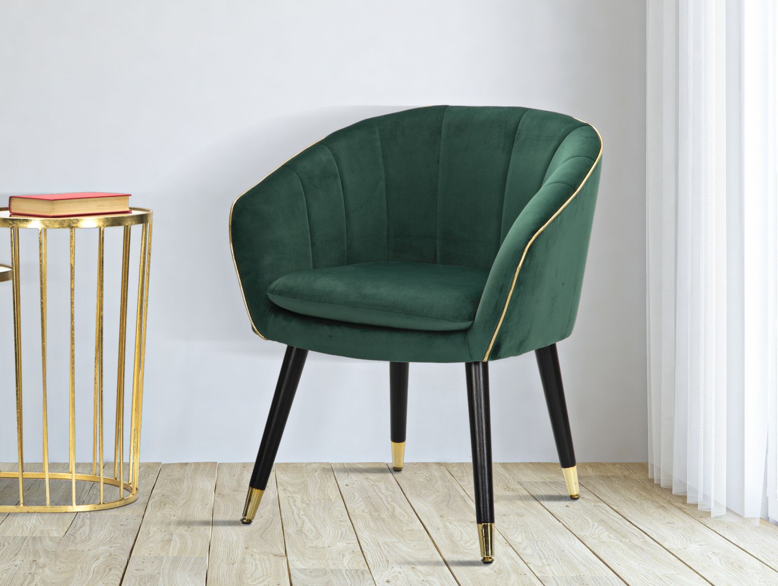 Poltrona in tessuto verde imbottito con rifiniture dorate e gambe in legno nero con dettagli in oro. L'eleganza del tessuto e dell'oro unite per offrire un comodo relax.