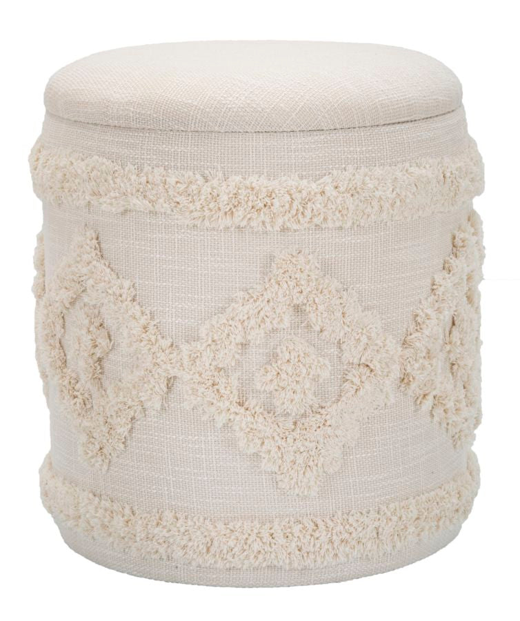 Pouf rotondo in tessuto imbottito elegantemente decorato, la seduta si apre rivelando un pratico contenitore.