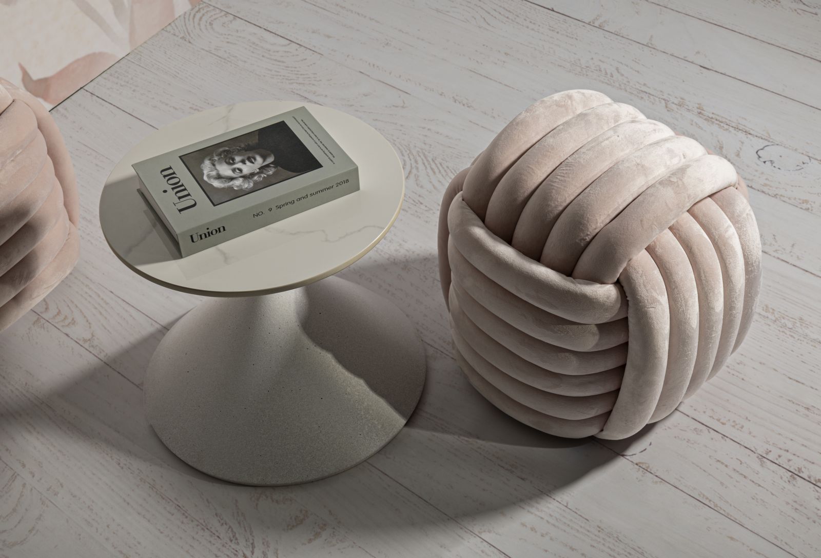 Pouff annodato in velluto rosa invita al relax con una sensazione accogliente e una nota di eleganza vibrante.