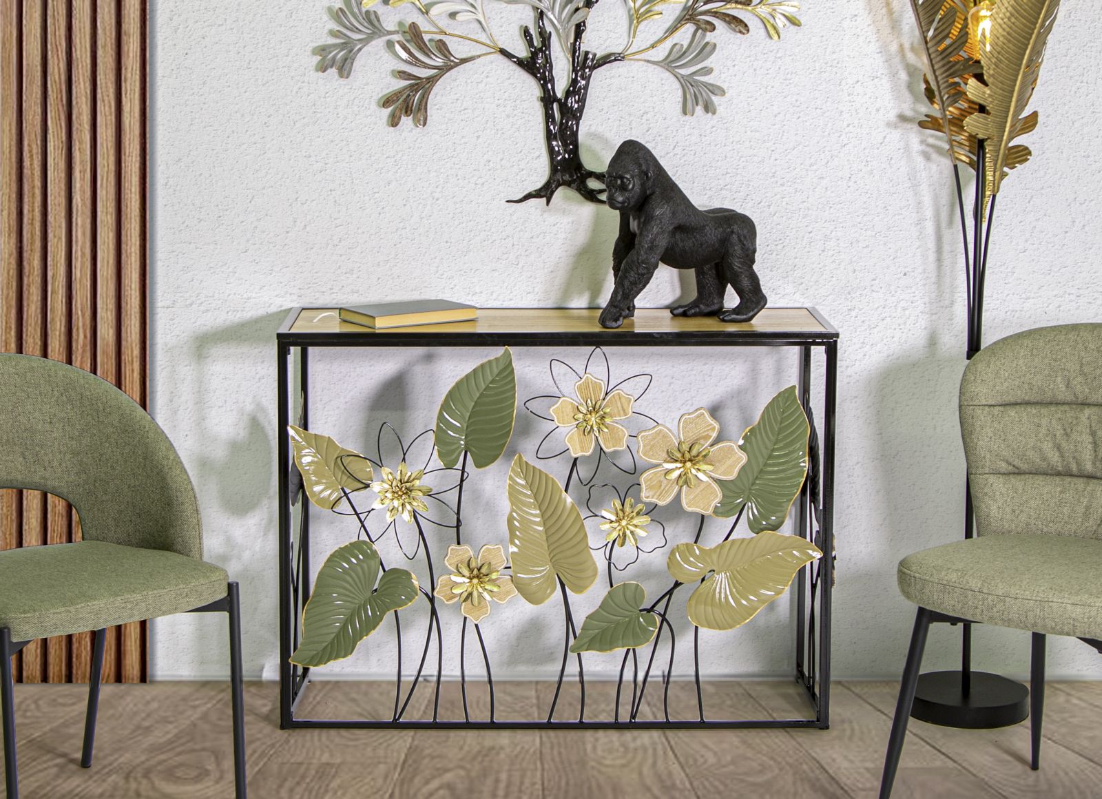 Console rettangolare in metallo nero con foglie e fiori decorativi e piano in legno marrone.