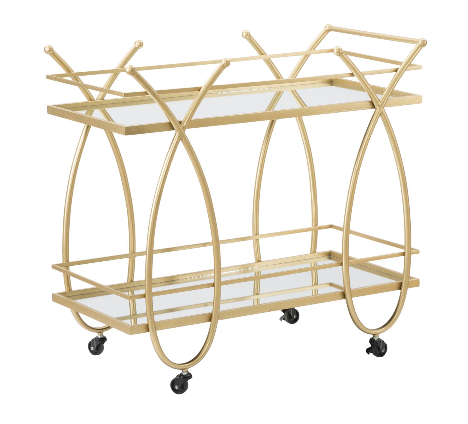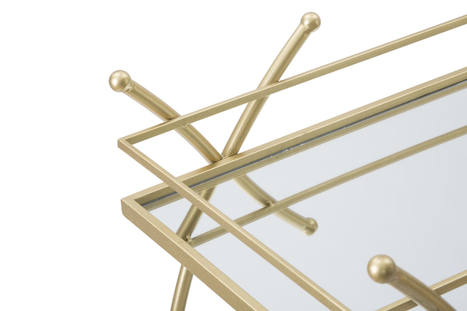 Carrello rettangolare in metallo dorato e vetro a specchio con 2 ripiani e pratiche ruote. Il metallo color oro dona un tocco di classe ad ogni ambiente glam. Le linee geometriche ed arrotondate si sposano perfettamente con ogni tipo di arredo.