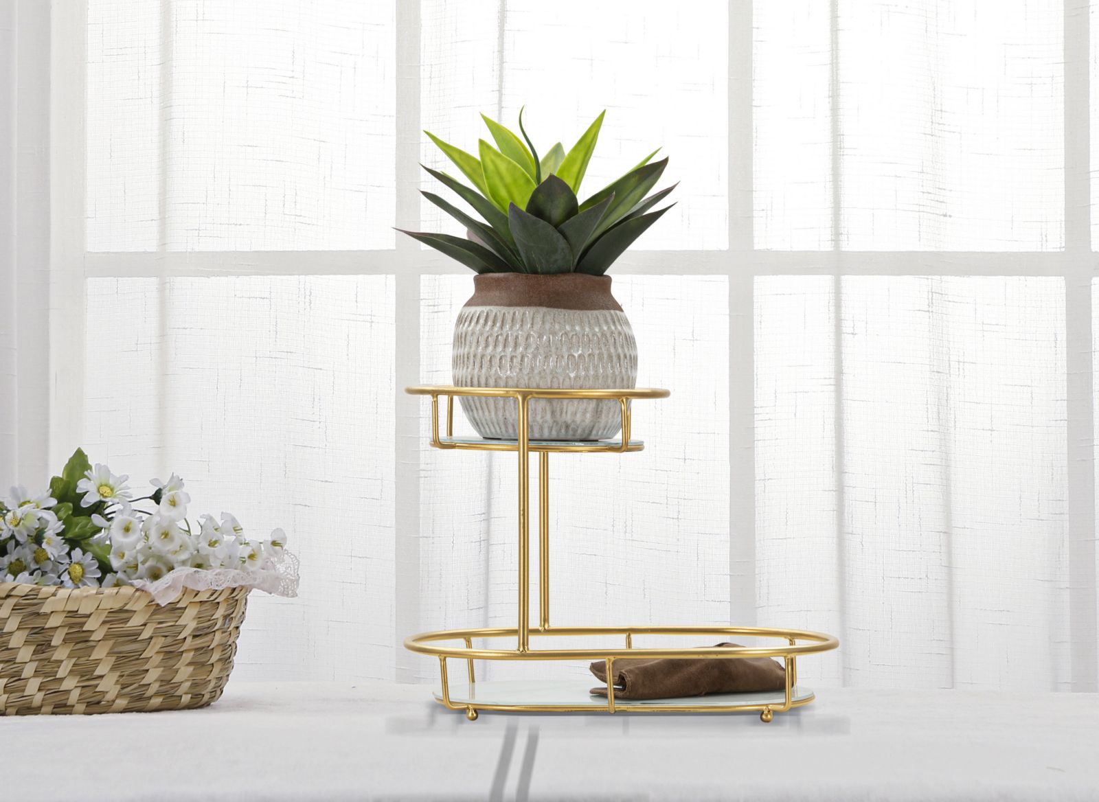 Svuotatasche su due livelli in metallo dorato con piani in vetro a specchio. La struttura particolare ma essenziale crea un oggetto utile e di design per unire praticit¨¤ e stile.