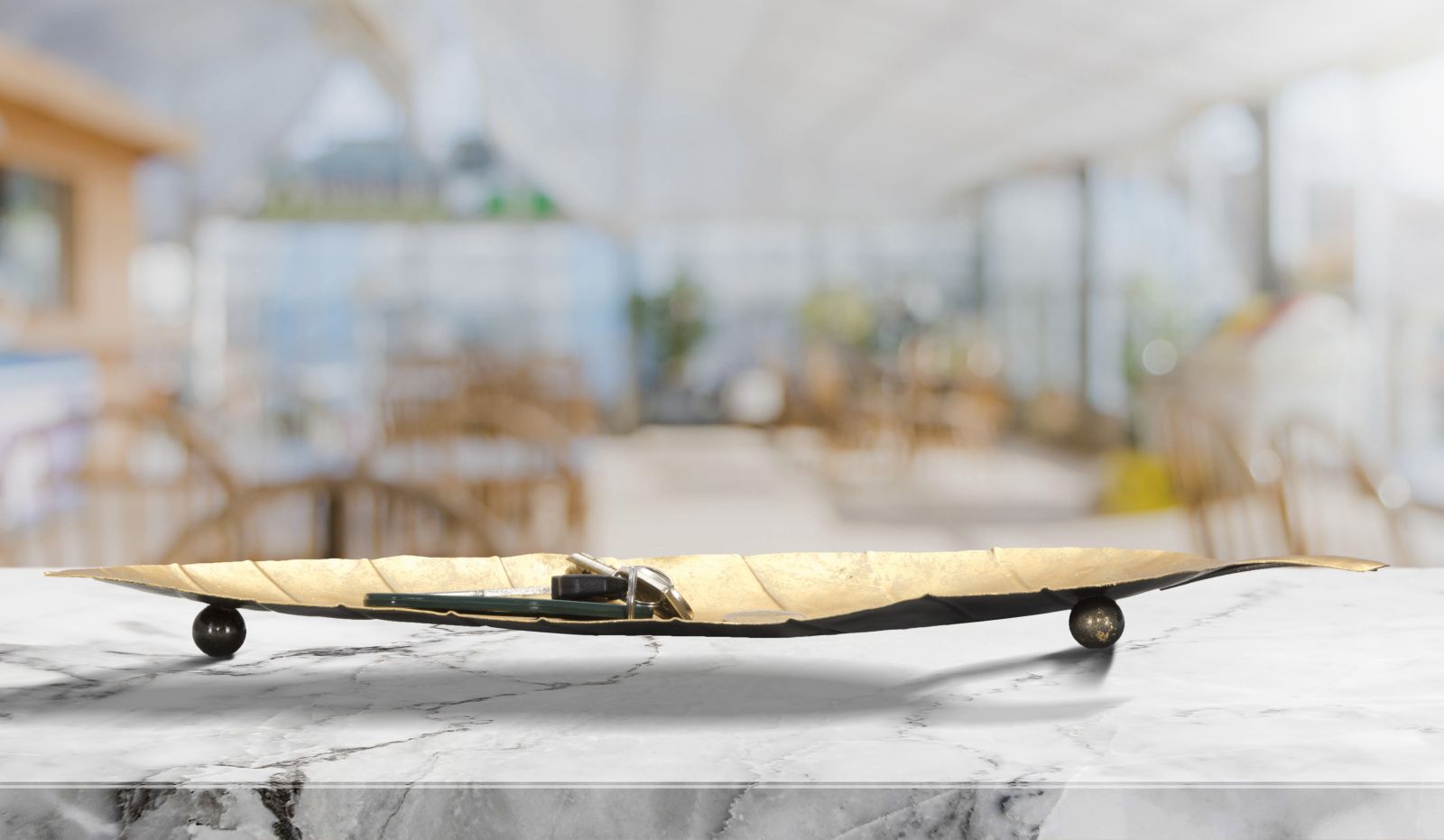 Elegante e pratico svuotatasche in metallo dorato a forma di foglia che richiama la natura.