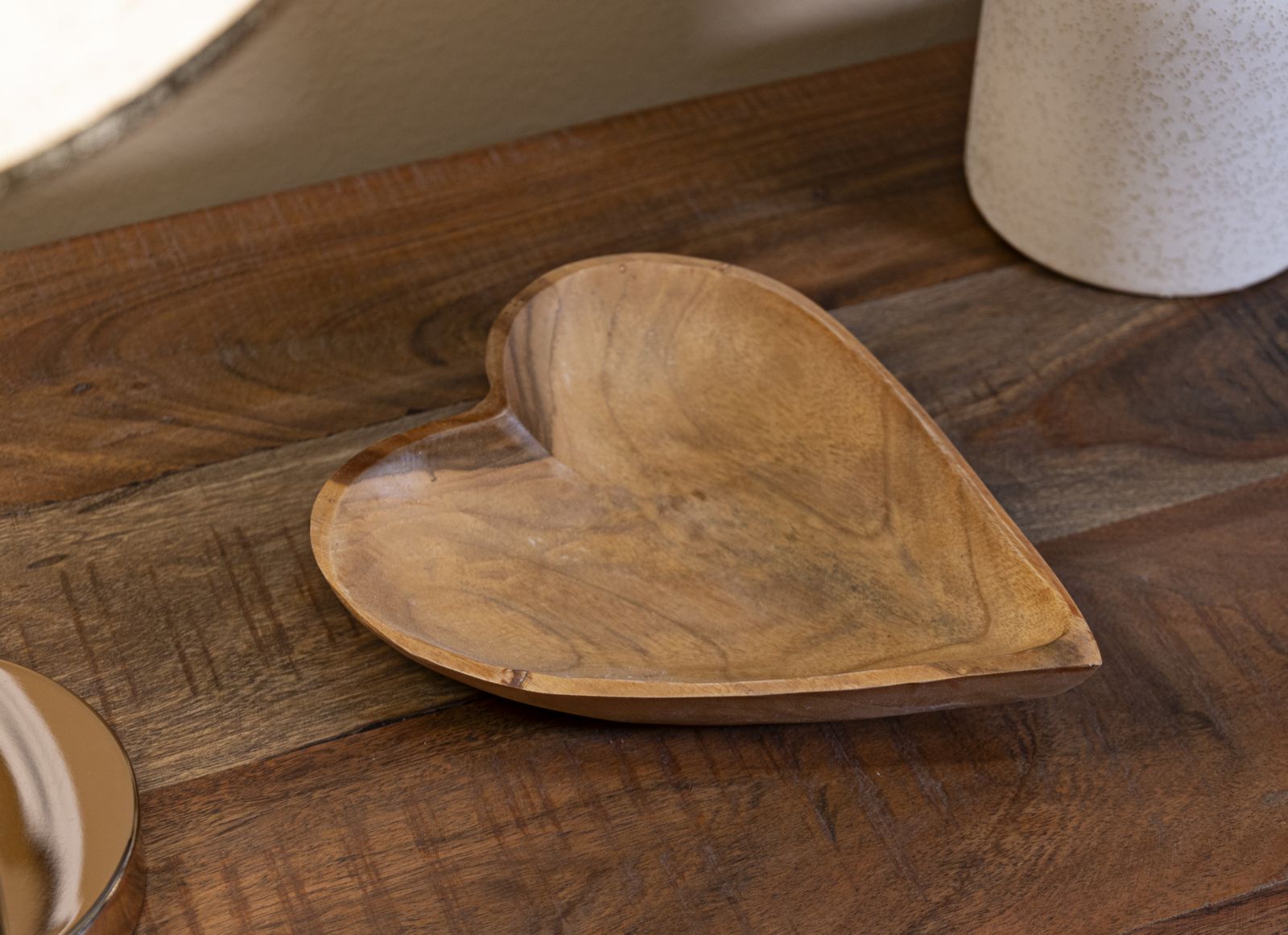 Svuotatasche a forma di cuore in teak riciclato, realizzato a mano, emana calore e charme. Ogni dettaglio artigianale lo trasforma in un pezzo unico, ideale per custodire con amore i tuoi piccoli oggetti quotidiani.