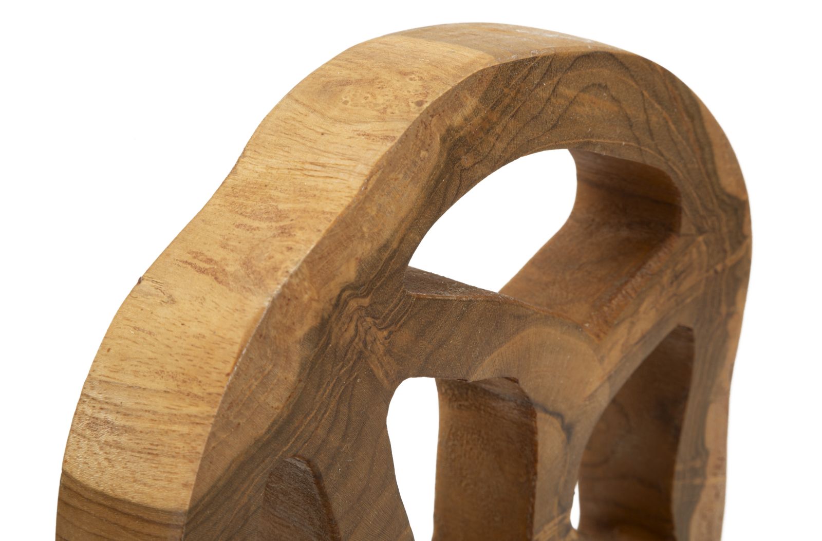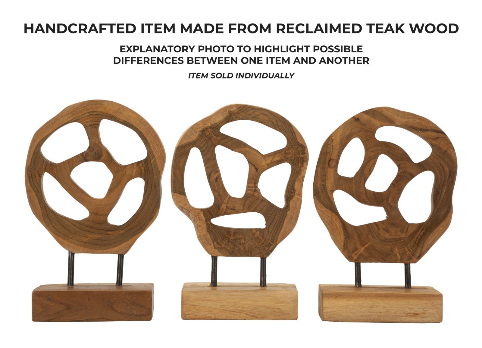 Scultura in teak riciclato affascina con le sue forme tondeggianti e le eleganti aperture sinuose. Ogni curva evoca un senso di leggerezza e raffinatezza, mentre il calore del legno riciclato conferisce unicit¨¤ e profondit¨¤ emotiva al pezzo.