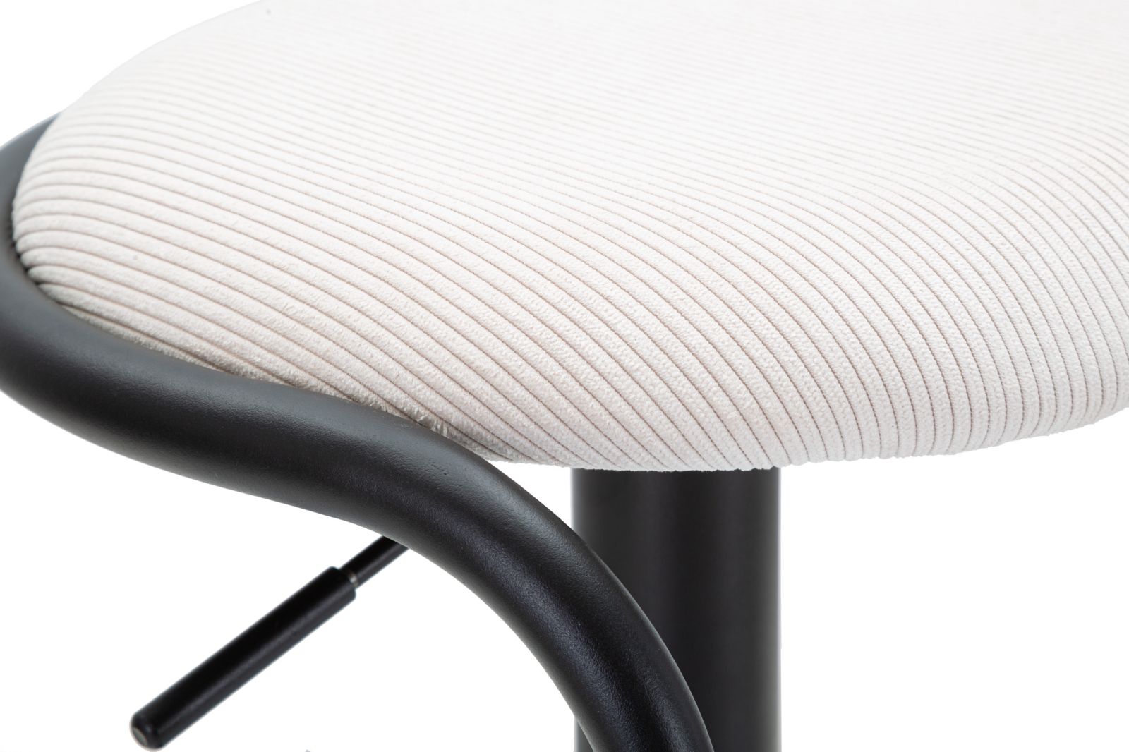 Sgabello bar rotondo girevole in metallo e tessuto imbottito. Completo di regolatore d'altezza. Il design semplice richiama gli anni '70.