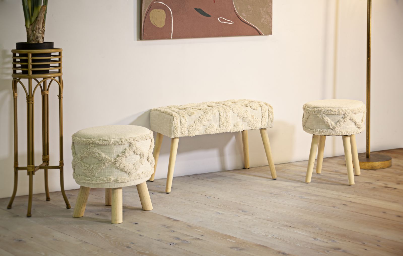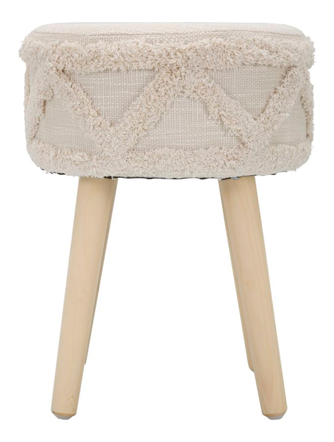 Sgabello rotondo in tessuto imbottito elegantemente decorato, con gambe in legno.
